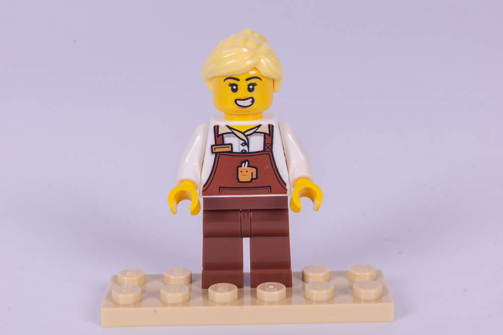 Als nächste Minifigur haben wir eine Barista (cty1926). Ihr Torso (973pb3256c01) wird seit 2015 (mit einer minimalen Änderung 2017) verwendet und macht sie damit Teil der monopolistischen Kaffeeshop-Kette LEGO Citys, kreativ als „The Coffee Chain“ bezeichnet. Ich mag diese Kontinuität über die Themenwelt sehr, und freue mich, dass die Kette nicht der Erneuerung vieler In-Universe-Marken und Farbschemen seit 2024 zum Opfer gefallen ist.