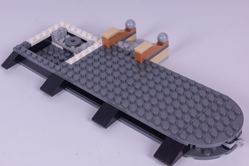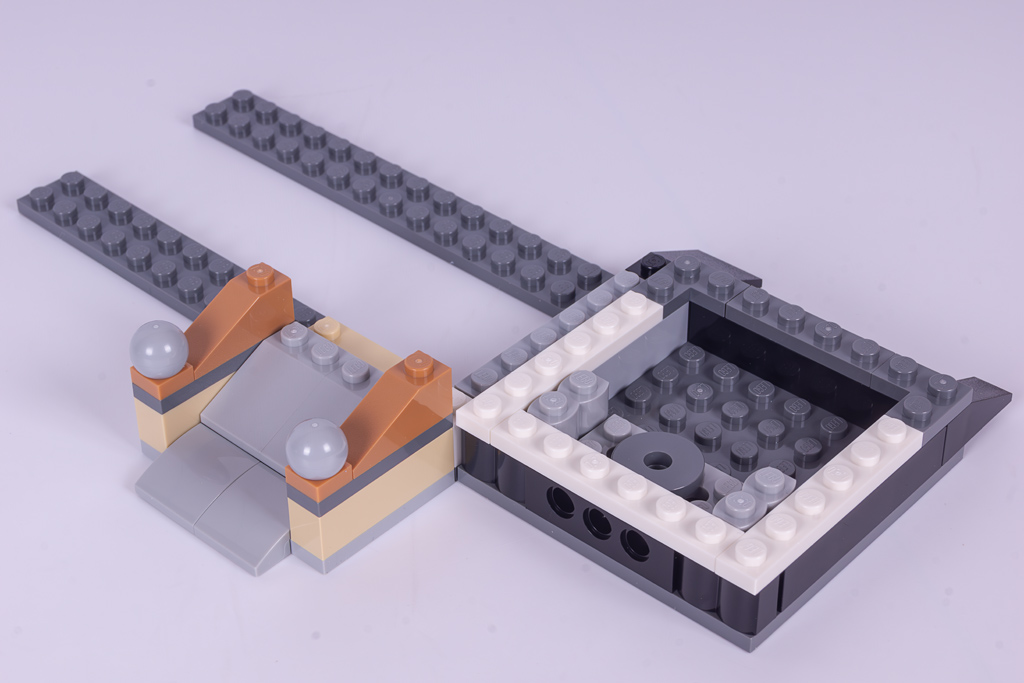 Eine bedruckte Kachel (3069pb0855) bildet die Steuereinheit des Vehikels, das in Wirklichkeit etwas besser aussieht als auf den Produktbildern und meinen Fotos. Trotzdem ist es sichtlich nicht der Fokus des Sets gewesen. Da LEGO aber bei größeren Sets versucht, kleine Nebenmodelle beizulegen, damit die modernen Kinder ohne Aufmerksamkeitsspanne trotzdem schnell etwas zum Bespielen haben können, mussten sich die Designer eben etwas einfallen lassen…