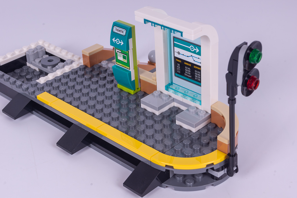 Zu den schönsten Modellen des ganzen Sets gehören der Fahrkartenautomat und das Wartehäuschen, dem aber echte Sitze gut getan hätten, nebst Kofferablage. Das Farbschema passt dabei zum 60335 Bahnhof und der Haltestelle der 60423 Straßenbahn mit Haltestelle, während der gelbe Warnstreifen neu ist. Außerdem haben wir hier ein recht hübsches Signal, dessen Bauweise bei City leider nie konsistent war.