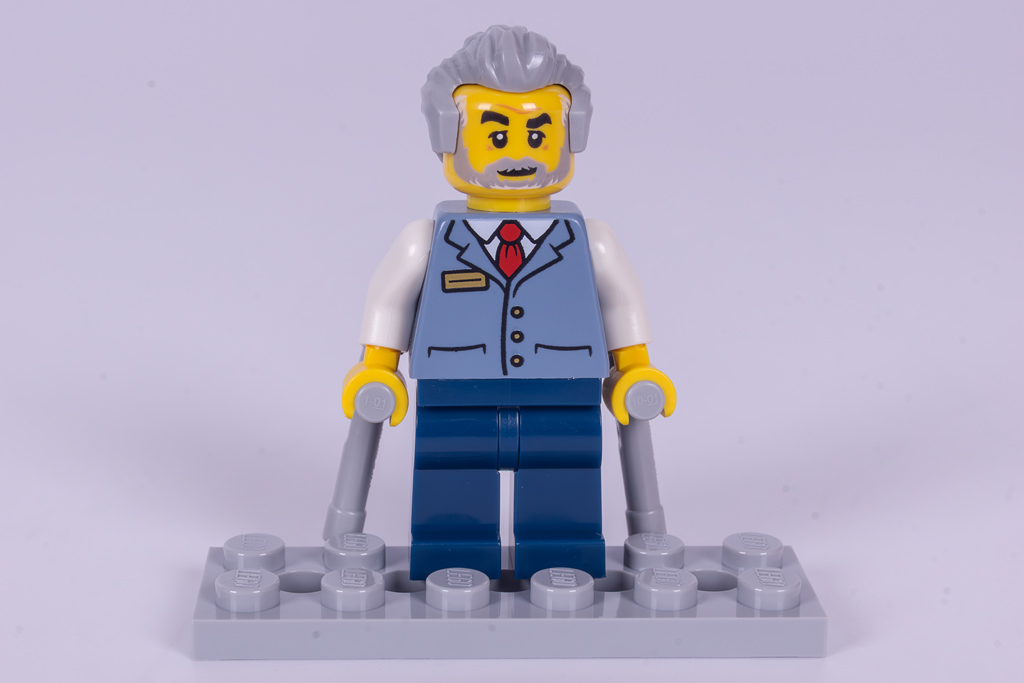 Der greise Stationsvorsteher (cty1928) trägt die sandblaue Uniform (973pb5664c01), die für die Mitarbeiter der städtischen Verkehrsunternehmen seit 2024 Vorschrift ist und mir gut gefällt. Viel besser aber sind die neuen Krücken (7185)! Diese sind seitdem nur noch in der 11371 Einkaufsmeile und einer CMF-Figur enthalten gewesen, werden uns aber sicher noch ein paar Jahre begleiten!