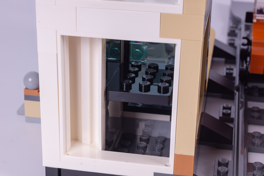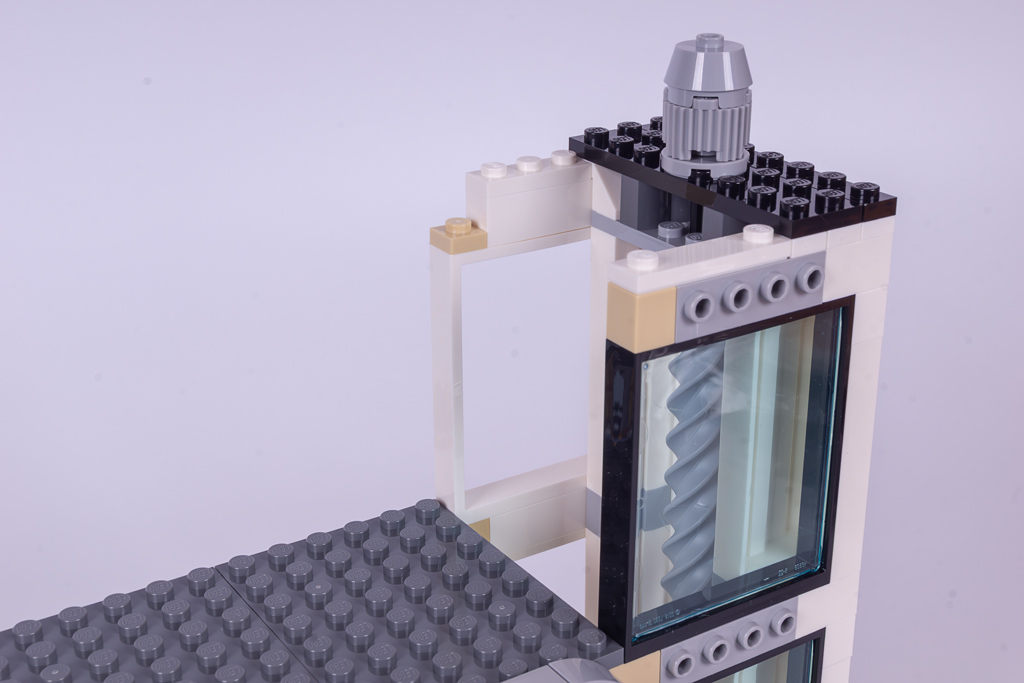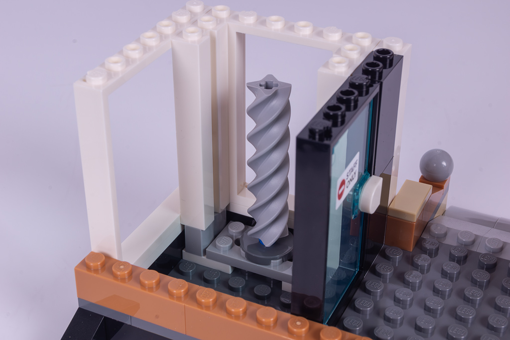 Leider gilt dies nur eingeschränkt für die Optik des Aufzugsschachtes: Einerseits gefällt mir die moderne Glasfront hervorragend, und auch der Aufkleber „Staff only“ an der Tür ist eine schöne Idee, die Zugänglichkeit zum Bespielen ist aber stark eingeschränkt. Außerdem wurden auch hier keine Fensterscheiben in die Seitenwände eingebaut, während die Formteile genau dafür konzipiert wurden.