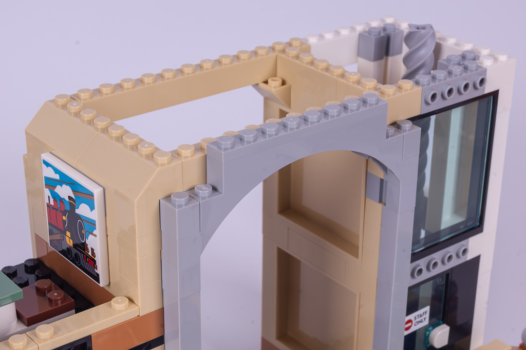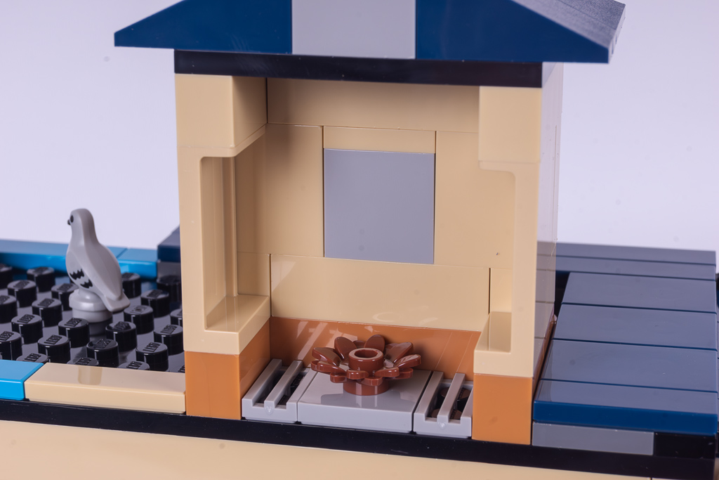 Einerseits verfügt der Bahnhof über einen wirklich gelungenen Außenbereich mit Bahnsteigen, Ticketautomaten, Wartehäuschen, Signal und Café. Auch die Fassade mit klassischen wie modernen Elementen gefällt mir gut, welche aber leider nur von vorn gut wirkt. An der Seite fehlen vernünftige Wände oder Fenster, deren Rahmen ja sogar bereits vorhanden sind. Und an der Rückseite kleben große Platten, deren Sinn und Zweck ich nicht sehe, nur ihren prekären Einfluss auf die Ästhetik des Sets. Zudem ist der Turm mit Bahnhofsuhr etwas zu klein für das Modell und wirkt doch arg verloren.
