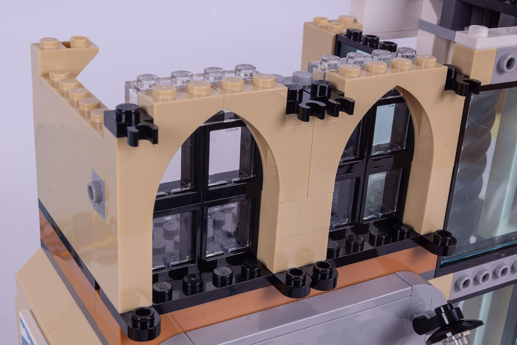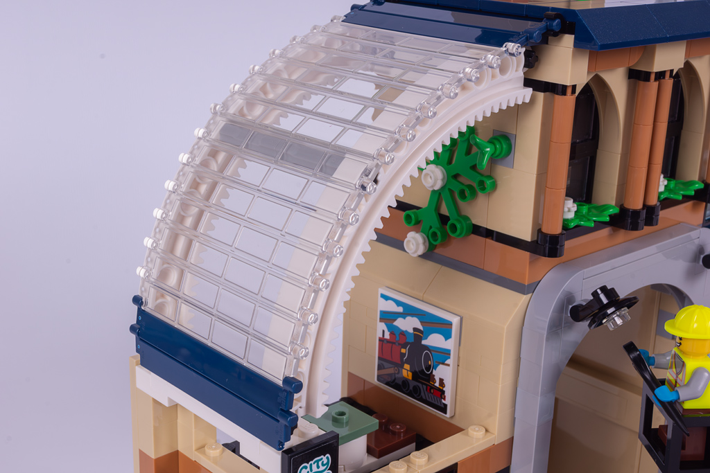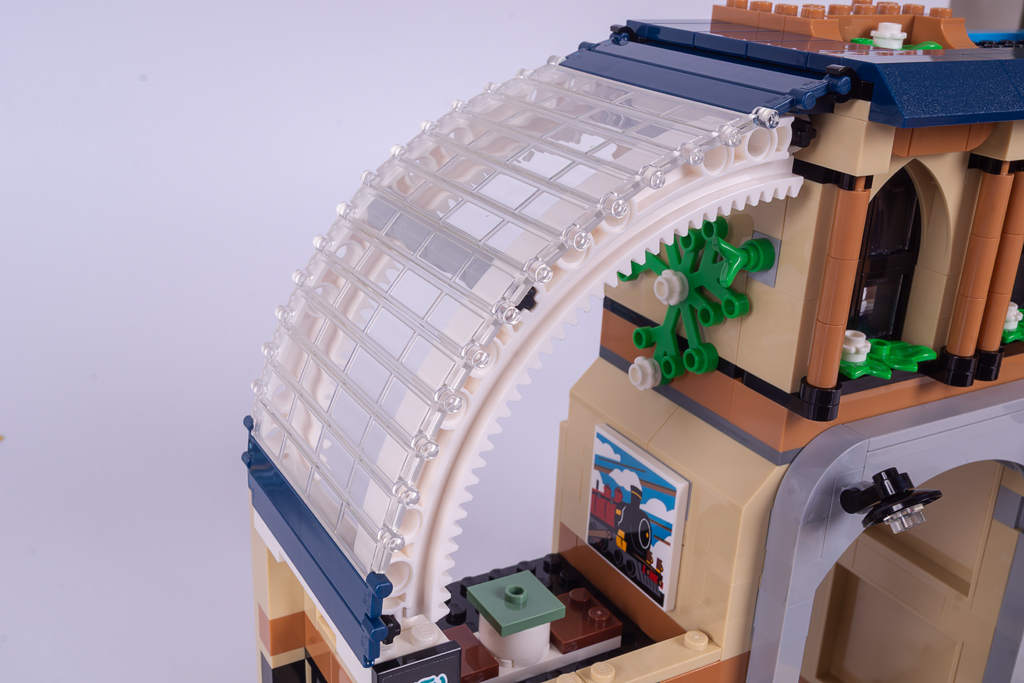 Den Abschluss des Hauptbahnhofs bildet die Dachstruktur. Links befindet sich ein sehr schönes Bogenfenster, für das Garagentor-Lamellen (4218) in Transparent und Dunkelblau lose über zwei gebogene Technic-Zahnstangen (24121) gelegt werden, die hier neu in Weiß sind. So schön die Idee und Optik ist, bei einem Spielset sollte man erwarten, dass die Teile ordentlich befestigt werden und nicht herumfliegen, wenn man das Modell bewegt.
