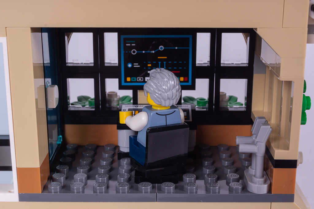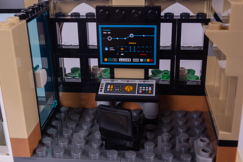 Leider ist die Einrichtung wieder extrem karg, mit nichts als dem Leitstand des Stationsvorstehers. Wenngleich dieser primär durch zwei Sticker gebildet wird, ist das grafische Design sehr gelungen, mit einer Referenz auf die 9-V-Geschwindigkeitsregler (2868b)! Rechts haben wir zudem eine ovale Platte (35480), in die die Krücken gesteckt werden können. Links neben dem Eingang wäre zwar für mich die logischere Position, aber dann hätte der Raum noch leerer gewirkt… Eine Topfpflanze etwa wäre eine sinnvolle Ergänzung gewesen, oder eine Spielzeugeisenbahn. Ein Bild mit einer X-Weiche (7996), nebst Preisschild, als hämische Anspielung auf LEGOs Widerwillen, dieses Element neu aufzulegen, wäre auch eine Möglichkeit gewesen…