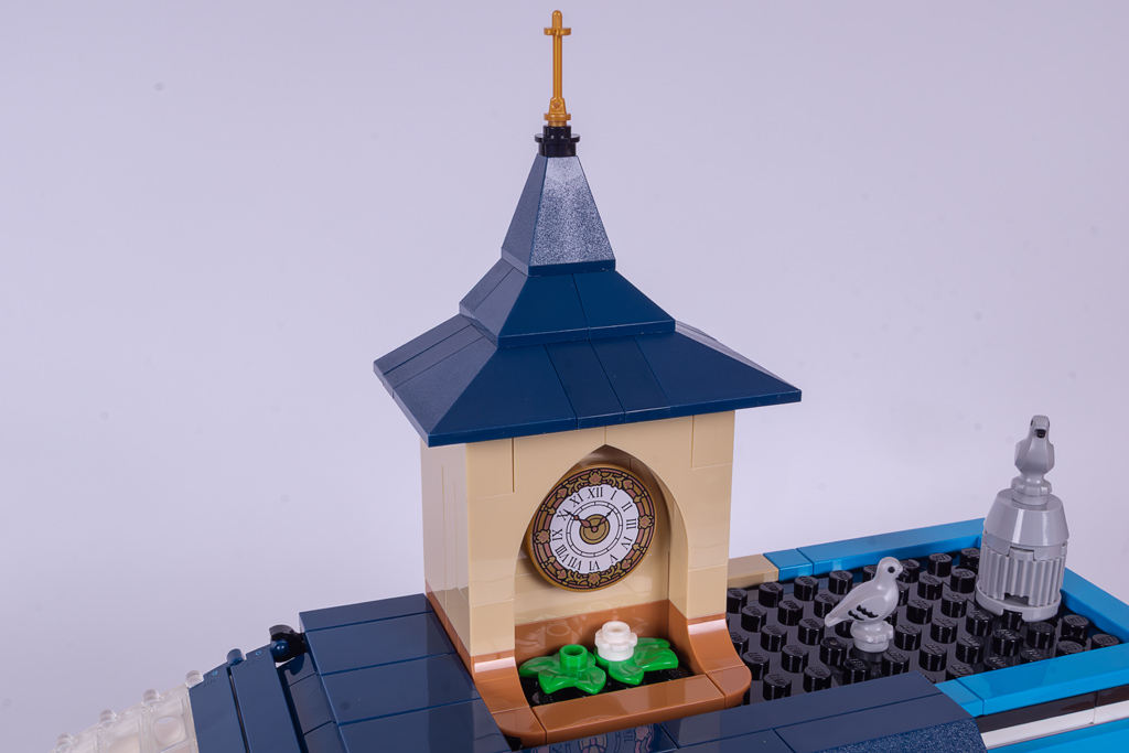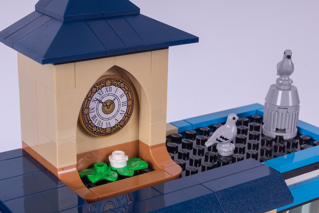 Das heimliche Highlight des Sets hat sich LEGO (und damit auch ich) bis zum Schluss aufgespart: Für den Hauptbahnhof und den 60473 City-Turm hat LEGO nun endlich Tauben (7188pb01) eingeführt! Die in jeder Stadt omnipräsenten Tiere glänzten bisher durch Abwesenheit, fortan kann ich meine Stadt aber realistischer gestalten… Beide Exemplare hier sind hellgrau, dank der 11371 Einkaufsmeile existieren sie mittlerweile aber auch in Weiß. Ideal wäre noch ein bläulich bedruckter Hals gewesen, aber auch so gefallen mir die Tauben, die hier – wie in echt – im Turm nisten.