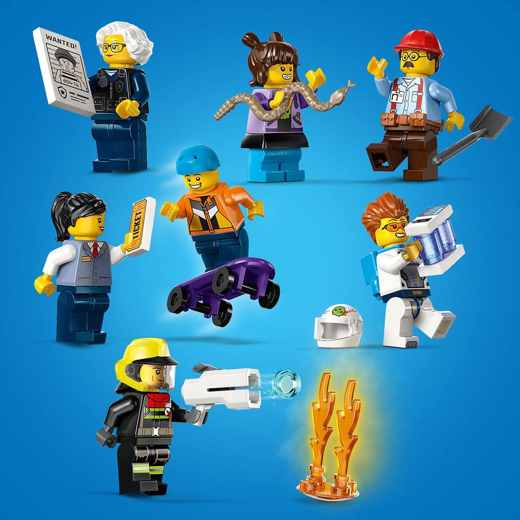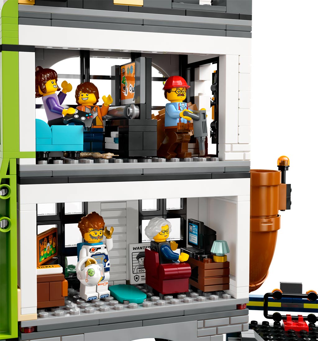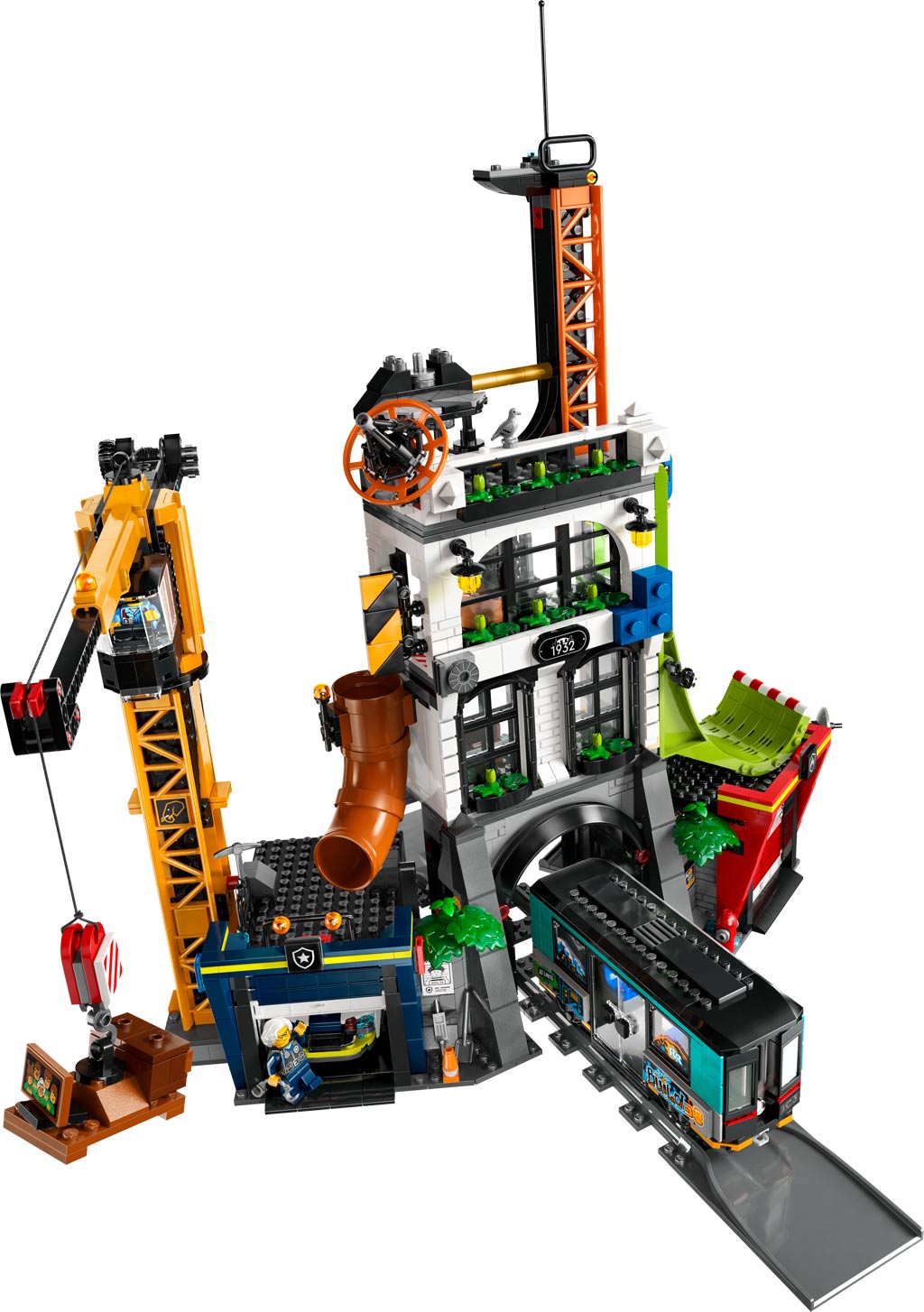 Der dreistöckige LEGO City-Turm beherbergt eine lebendige U-Bahn-Station sowie benachbarte Polizei- und Feuerwehrwachen. Kinder können in actionreiche Szenarien eintauchen, indem sie ein Raumschiff von der Startrampe auf dem Dach starten, einen Baukran bedienen und Stunts auf der riesigen Skate-Rampe vollführen. Mit sieben Minifiguren, darunter ein Feuerwehrmann, ein Lokführer und fünf Figuren aus der TV-Serie „LEGO City No Limits“, sind die Spielmöglichkeiten endlos!