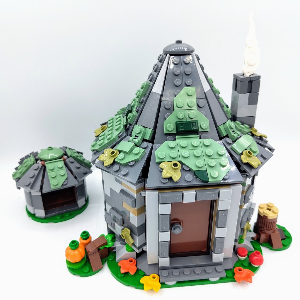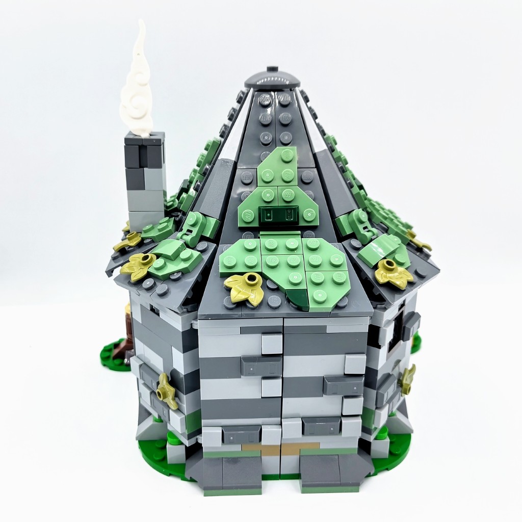 Viele hell- und dunkelgraue Standardsteine, aufgelockert durch klassische „Ingotfliesen“ dominieren die Optik des Sets von außen und fangen das Filmvorbild meiner Meinung nach sehr gelungen ein. Die grauen Elemente werden durch die grünen Platten und verschiedene Pflanzen, auch auf dem Dach, aufgelockert. Der weiße Rauch aus dem Schornstein verrät uns zudem – bei Hagrid ist es wohlig warm!