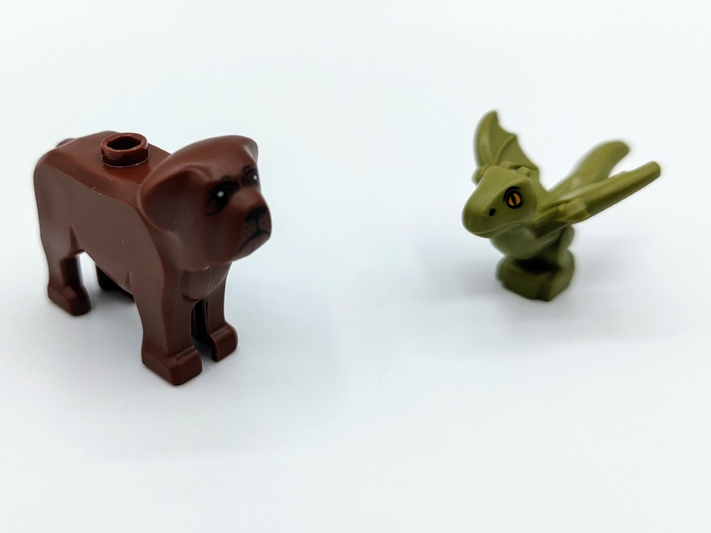 Bei einem Blick auf die Teileliste fällt direkt auf: LEGO hat extra für dieses Set zwei neue Tiere aufgelegt, die, Stand jetzt (05/2025), auch weiterhin exklusiv nur in diesem Set erschienen sind. Zum Einen Hagrids großen, kräftigen, aber ausgesprochen lieben Saurüden Fang, zum Anderen den Babydrachen Norbert. Schön, dass es Fang jetzt als eigenes Formteil ins LEGO Sortiment geschafft hat!