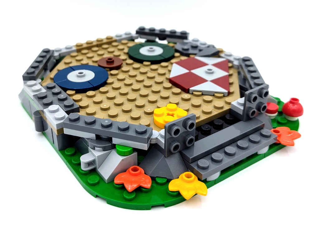 Achteckig präsentiert sich die fertige Hütte. Das Dach lässt sich im Ganzen abnehmen und dank einiger Gelenke lässt sich die Hütte aufklappen, um bespielt zu werden, im geschlossenen Zustand macht sie von allen Seiten einen guten Eindruck. Durch geschickte Steineverwendungen klappt sie auch nicht so schnell „aus Versehen“ auf, mehrere bricks modified sorgen dafür, dass sanfter Druck zum Aufklappen notwendig ist.