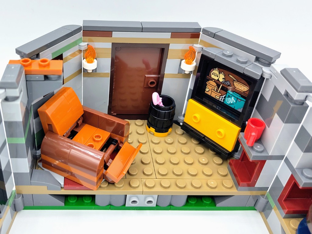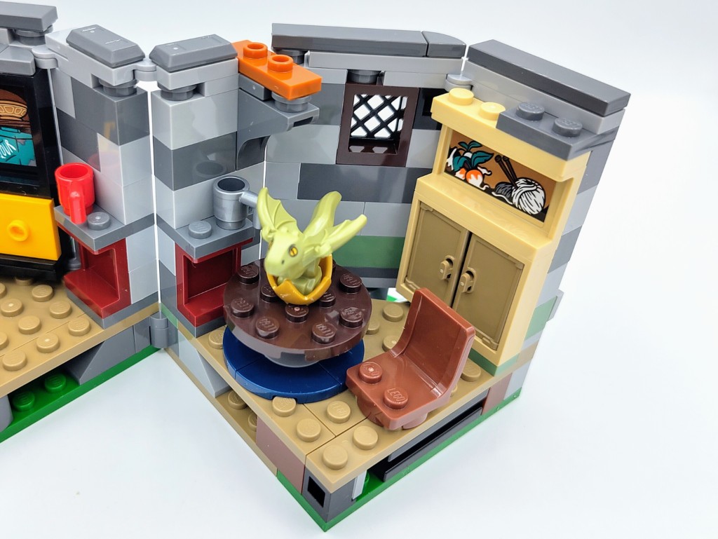 Auf dem Kaminsims finden sich zwei, mit einem Karomuster bedruckte, 1×1 halbrunde Fliesen – vermutlich sollen sie Hagrids Handschuhe darstellen. In dieser Form sind die Fliesen bisher exklusiv. Was fehlt ist jedoch eine Art Backofen – denn irgendwo muss Hagrid ja seine gefürchteten Felsenkekse zubereiten.