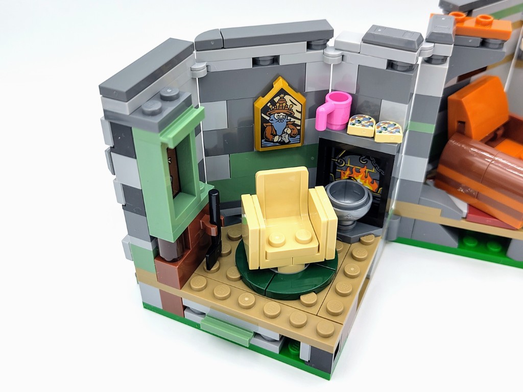Ausgestattet ist das Gebäude mit zwei Sesseln, einem Stuhl, mehreren Schränken und einem Kamin. Der mächtige, fünf Noppen breite Sessel ist zweifelsohne für den Hausherren Hagrid gedacht.