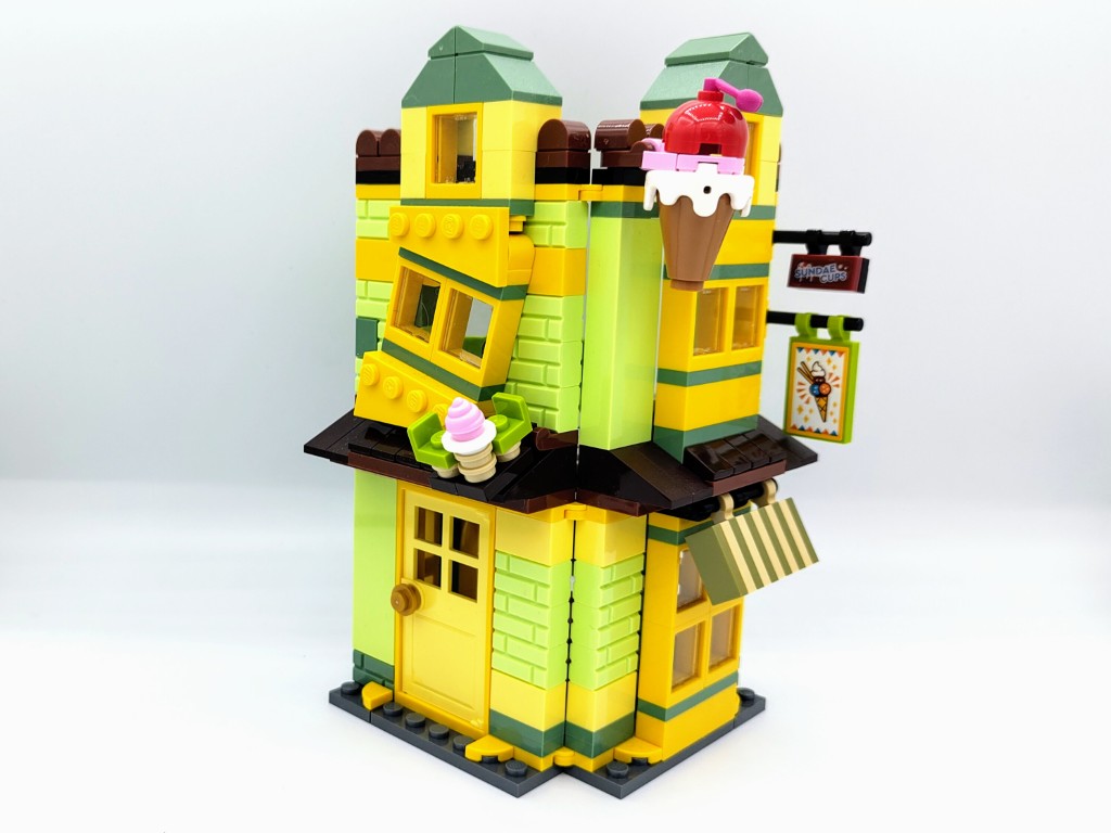 Der Sommer ist längst vorbei – aber Eisspezialitäten schmecken ja das ganze Jahr. Im LEGO Sortiment findet sich seit Anfang Juni gibt ein neuer steiniger Eissalon, in dem es magisch zubereitete Süßspeisen zu erwerben gibt. Zusammen mit Qualität für Quidditch ergänzt Fortescues Geschäft die Reihe der Gebäude der Winkelgasse. Die magische Einkaufsstraße im Herzen von London wird von LEGO nach den Sets 76422 Winkelgasse: Weasleys Zauberhafte Zauberscherze und 76439 Ollivanders & Madam Malkins Anzüge schon um die Gebäude fünf und sechs ergänzt.