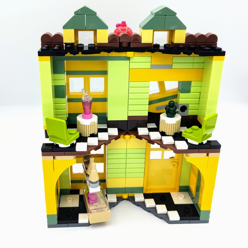 Das größere der beiden Gebäude kommt farblich mit einer Kombi aus nougat, dunkelrot, braun und grau daher und ist an die Seiten geschlossen. An der Fassade gibt es einen Wegweiser zu weiteren Geschäften – ein Hinweis auf weitere Sets in der Zukunft?