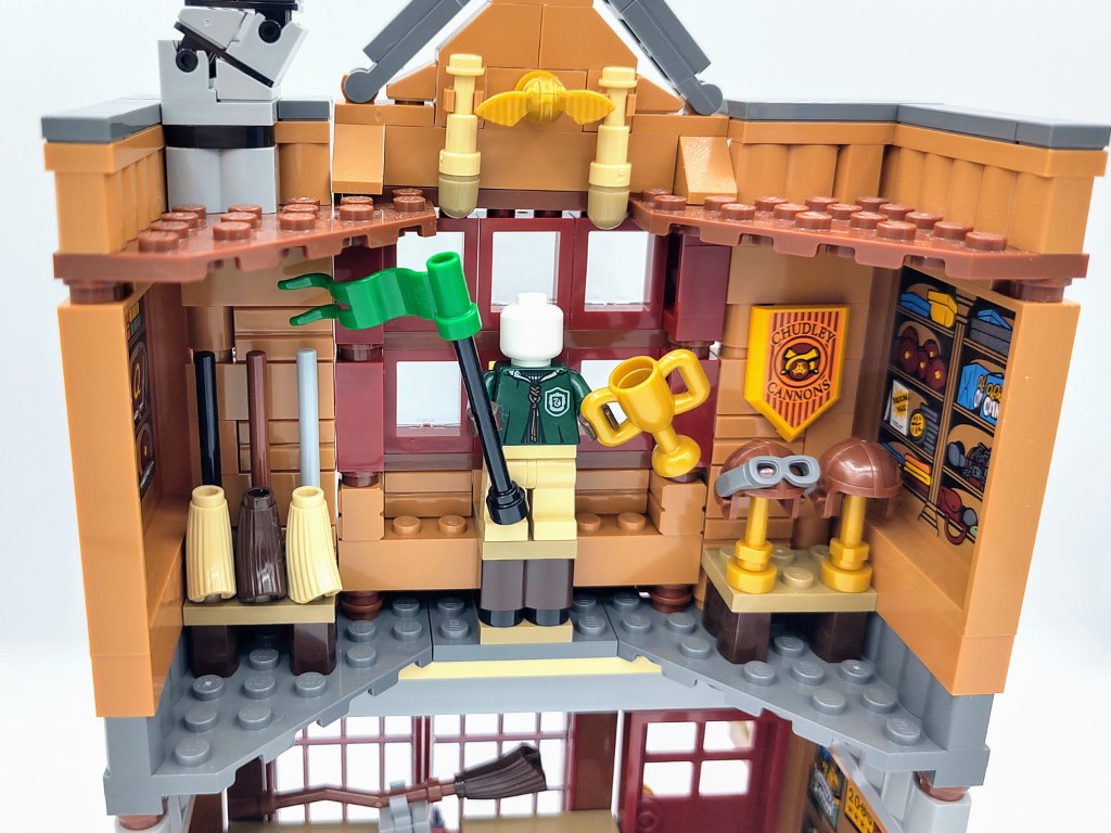 Weiteres Zubehör finde sich einen Stock darüber, etwa zwei Helme, ein Wimpel, Schläger und ein Schnatz, aber auch drei Besen (in Einzelteilen). Eine Minifigur als Schaufensterpuppe präsentiert das Trikot der Hausmannschaft der Slyterins.