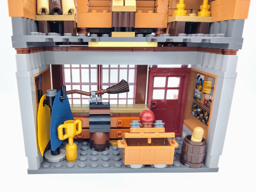 Im Erdgeschoss werden allerhand Utensilien für ein erfolgreiches Spiel zum Kauf angeboten – Umhänge, ein Schläger und ein Pokal. Im Schaufenster wird darüber hinaus ein Besen präsentiert. Dieser ist beweglich gelagert – durch die Drehung an einem Zahnrad an der Vorderseite bewegt er sich gemütlich auf und ab sowie vor und zurück – toll umgesetzt, die entsprechende Szene aus dem Film habe ich direkt vor Augen.