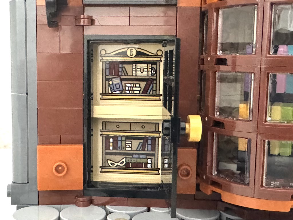 Hinter der Tür ist ein Bücherregal angedeutet, das leider einzig aus einem Sticker besteht. Grund dafür, dass das Regal gebaut ist, dürfte die geringe Tiefe der Häuser sein. Es handelt sich eben nur um Fassaden.