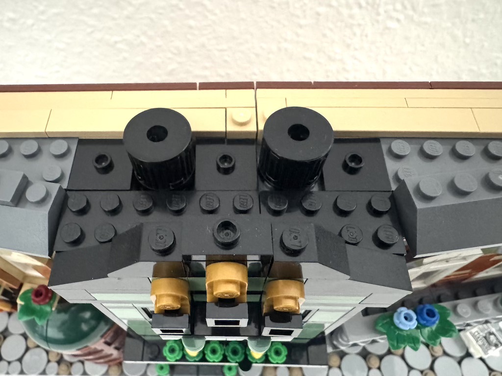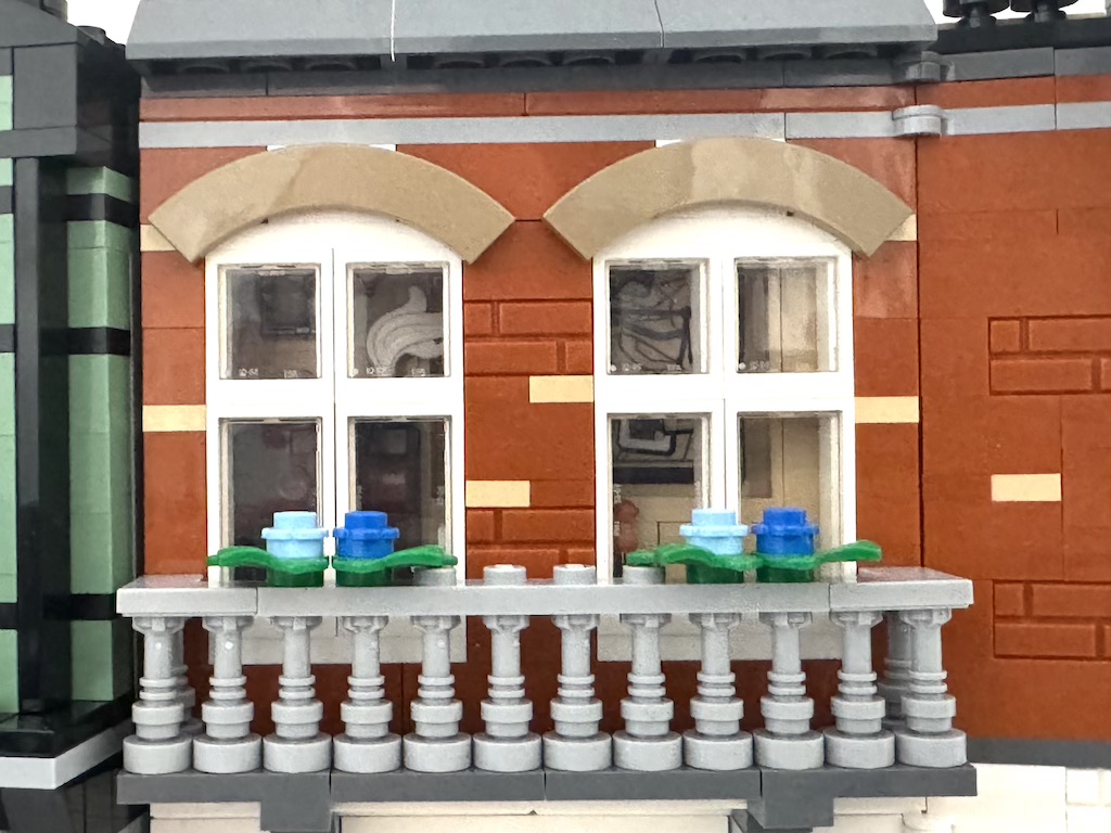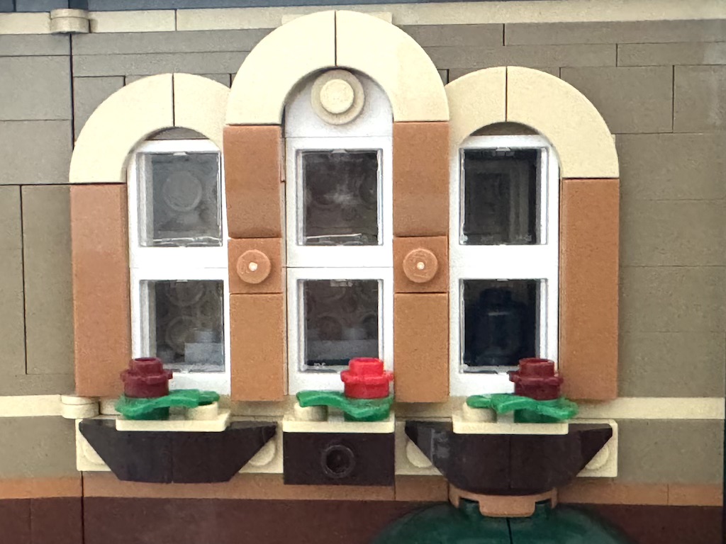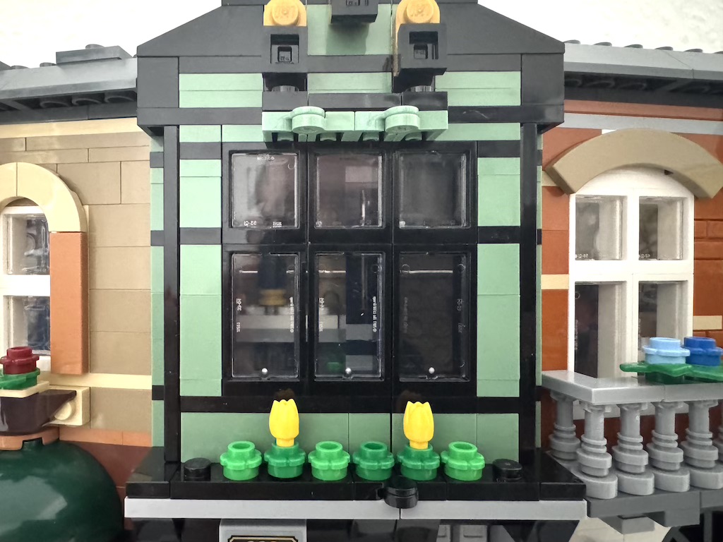 Das mittlere Gebäude ist im schicken Sandgrün gehalten. Es deutet den Fachwerkstil an und ist ebenfalls mit ein paar Blumen verziert. Ein kleines Manko ist hier die Sichtbarkeit einer Technic-Konstruktion im Inneren durch die Fenster.