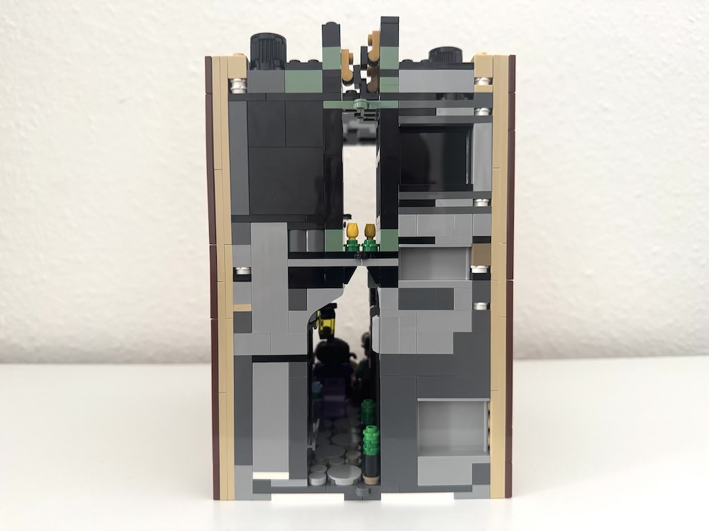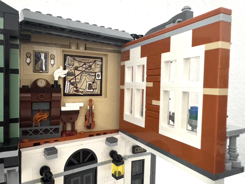 Glücklicherweise lässt sich die gesamte Front aufklappen, sodass die Wohnung offenbart wird. Auch diese ist gerade mal eine Noppe breit und deutet daher die Einrichtung nur an. Immerhin sind mit einem Kamin, einem Tisch und einer Geige hier sogar gebaute Details eingebracht. Abgerundet wird das Ganze von einer Pinwand, die alle im Modell versteckten Hinweise auf Rätsel miteinander verbindet,,,