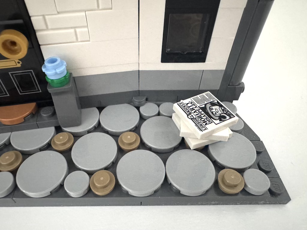 Im Außenbereich liegt ein Stapel bedruckter Zeitungen, die über das Verschwinden von Moriarty berichten. Die Straße ist durch Runde Fliesen und Platten verziert und fängt die Pflastersteinoptik dieser Zeit wunderbar ein.