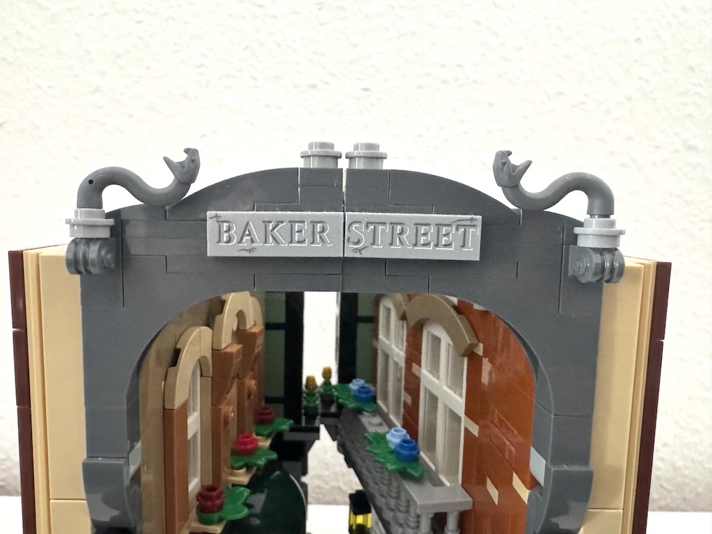 Oberhalb der Front ist ein kleiner Bogen angedeutet, der neben schlangenartiger Verzierungen auch einen bedruckten (!) Baker Street Schriftzug aufweist. Dahinter sind sind die beiden Hälften mittels Scharnieren miteinander verbunden und lassen sich leicht öffnen.