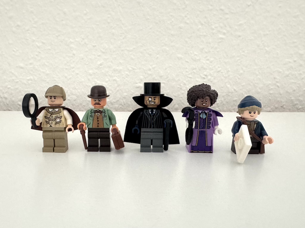 Fünf sehr detaillierte Minifiguren sind im Setumfang enthalten. Allen voran natürlich der titelgebende Sherlock Holmes samt funktionierender Lupe und dessen Assistent Dr. Watson. Irene Adler und Paige unterstützen das Ermittlerduo beim Aufspüren des finsteren Professor Moriarty! Die Figuren sind recht detailliert gestaltet und passen gut in das viktiorianische Setting. Die Darstellung basiert auf den Beschreibungen der Bücher und somit nicht auf einer der hieisgen Film- und Serienadaptionen.
