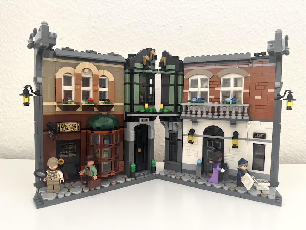 Das Sherlock Holmes Book Nook ist eine gelungene Ergänzung in die neue Subthematik der LEGO Icons. das Modell macht sowohl aus- als auch zugeklappt einen sehr schönen Eindruck und lässt sich toll ins Bücherregal eingliedern. Die vielen verschiedenen Anspielungen und Rätsel sorgen für eine gern gesehene Belebtheit der kleinen Welt und die Häuserfassaden sind wunderschön umgesetzt. Die Innenräume sind zwar eher spärlich und vor allem durch Sticker eingerichtet, aber da diese eh nur kleine Anspielungen liefern sollen und die Fassaden hier Hauptaugenmerk sind, kann ich das durchaus verkraten. Wer mehr Einrichtung im Innenraum fordert sollte eher zu Modular Buildings greifen. Bei dem hier vorliegenden Konzept geht es schließlich eher um die Darstellung der Straßenkulisse. Das größte Manko ist für mich ganz klar der Preis. Das Set ist sicherlich gut 20 Euro zu teuer, aber duch die Verfügbarkeit im freien Markt, purzeln bereits die Rabatte. Daher kann ich dieses Modell fast uneingeschränkt jedem Bücherfreund und Sherlock Holmes Fan für eine entspannte Bauzeit und einem schönen Hingucker im Bücherregal empfehlen!