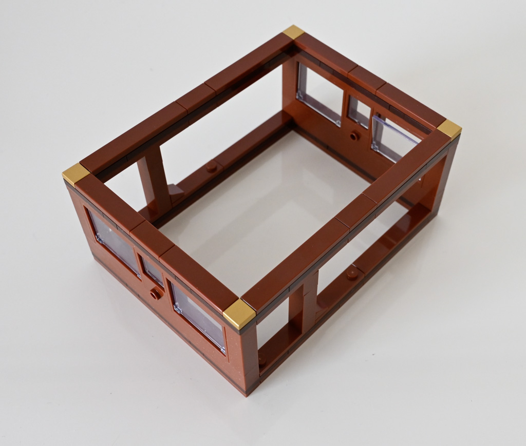 Der Aufbau gliedert sich in drei Hauptabschnitte: hier werden jeweils die Regaleinheit mit jeweils zwei Mineralien gebaut. Die Regale werden aus braunen LEGO-Elementen aufgebaut, in denen transparente Fensterteile als Präsentationsfläche fixiert sind.