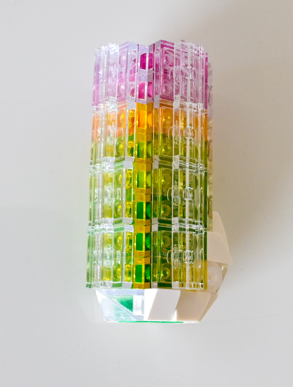 - Fluorit Diese Nachbildung nutzt eine Kombination aus transparenten grünen und violetten Elementen, um die typische Farbvielfalt des Fluorits darzustellen. Die Kristalle sind pyramidenförmig angeordnet und wirken durch die klare Linienführung sehr strukturiert.