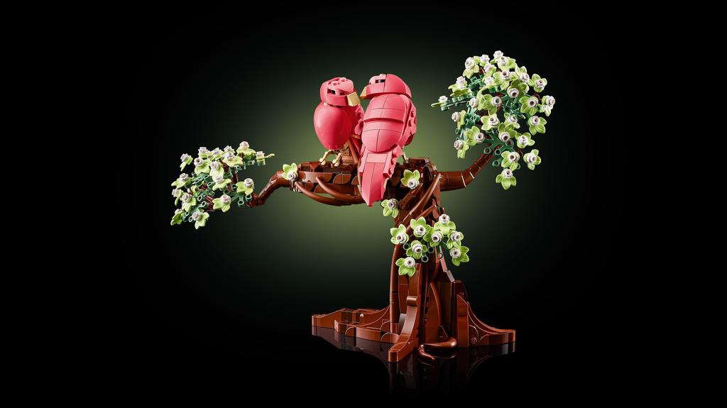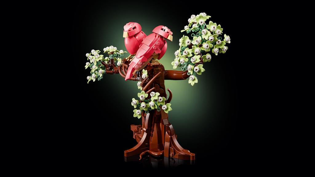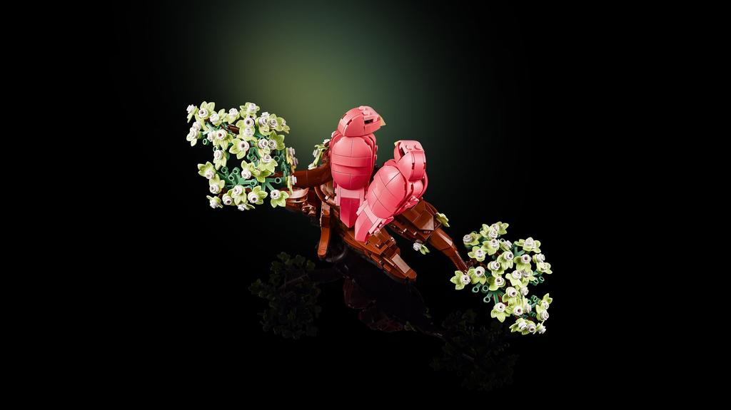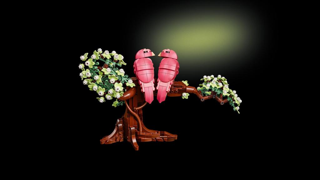 Die in Coral und dem neuen Rosaton gehaltenen Turteltauben sitzen auf einem knorrigen Baum mit Blättern in Grün und Yellowish Green, mit weißen Blüten. Das gesamte Modell misst 31 Zentimeter in der Breite und 22 Zentimeter in der Höhe. Und natürlich kann es auch von zwei Baumeistern gleichzeitig gebaut werden! Nur – wer will das schon?! Die Hälfte des Bauspaßes abgeben?