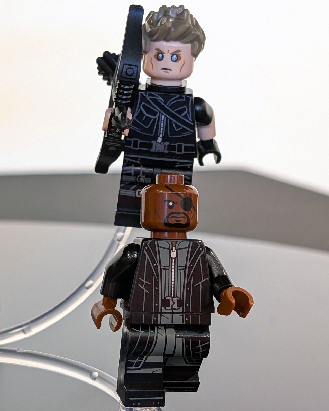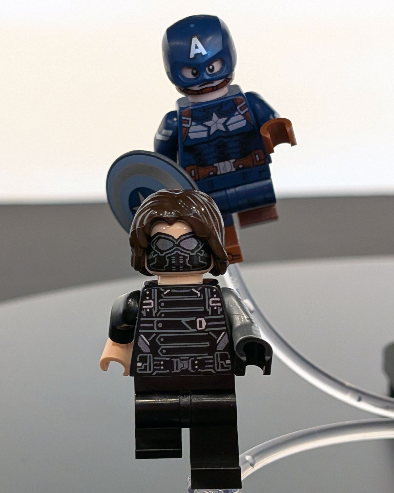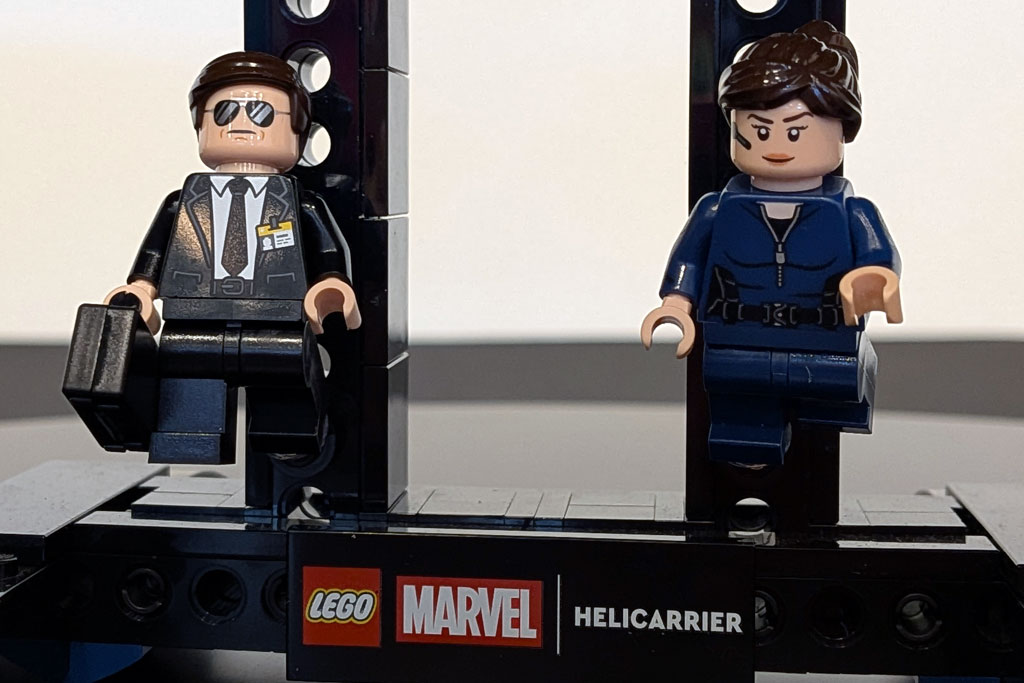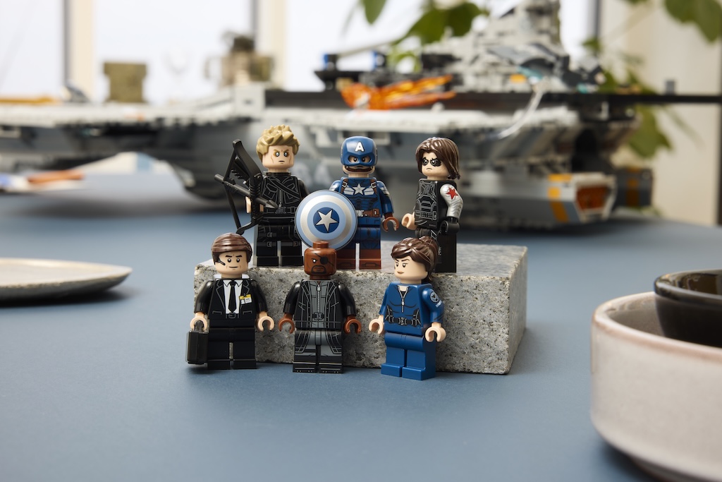 Trotz des Miniaturmaßstabs sind Minifiguren enthalten, die allesamt neu und exklusiv sind. So erhalten wir Charaktere aus zwei Filmen: Captain America (Stealth Suit) und Winter Soldier aus The Return of the First Avenger, aber auch Nick Fury, Agent Coulson, Maria Hill und Hawkeye (Gedankenkontrolle) aus Marvel’s The Avengers.