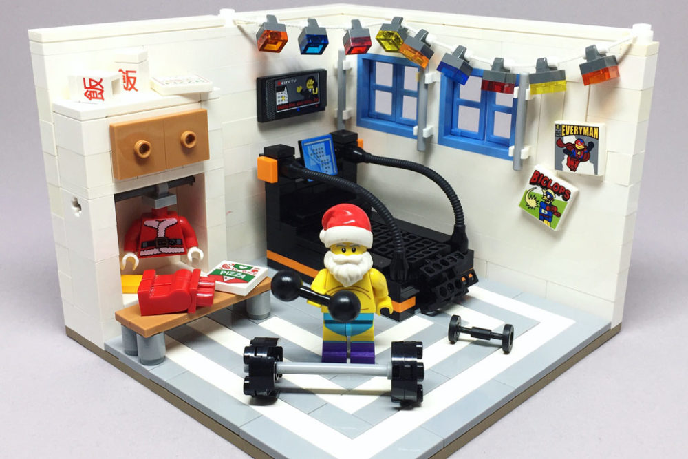 Weihnachten naht, und der Weihnachtsmann bringt sich schon mal in Form: Dies ist nur eines von vielen kleinen Dioramen, die Sebastian Bachórzewski kreiert hat. Die Fantasie ist mit dem Baumeister ein Glück durchgegangen. Der Weihnachtsmann also läuft seine Kilometer auf dem Band, und Gewichte werden natürlich ebenfalls gestemmt. Und im Schrank hängt bereits das passende Outfit für den nahenden großen Auftritt.