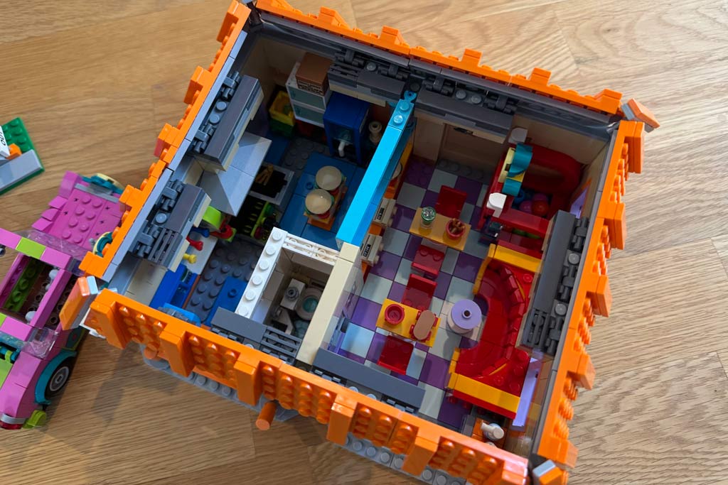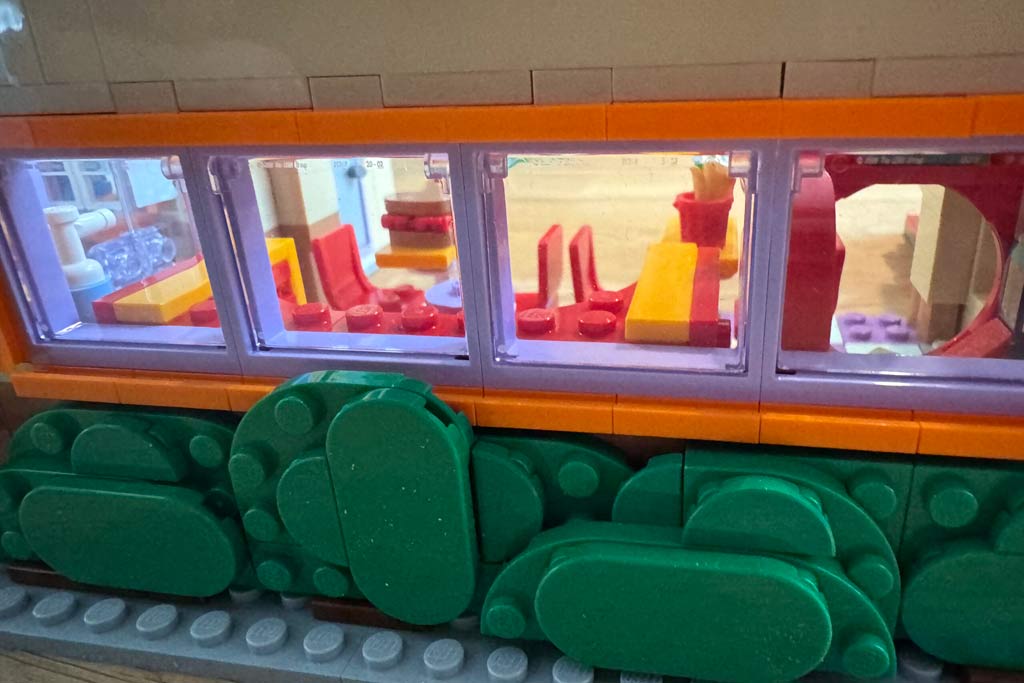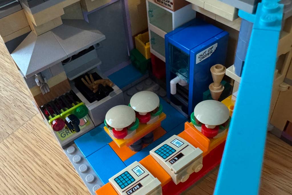 Beim Aufbau merkt man schnell, wie viel Liebe zum Detail in das Set eingeflossen ist. Oder anders formuliert: Auf beengtem Raum wurde tatsächlich gefühlt jede Noppe benötigt. Besonders beeindruckend ist der Innenraum, der verschiedene Bereiche bietet – vom klassischen Tresen mit Burger-Station, über den Grillbereich bis hin zu den typischen Sitzecken. Die Kinderspielecke mit dem bunten Bällebad und die kleine Toilette sind charmante Details, die für zusätzlichen Spaß sorgen. Ein besonderes Merkmal ist, dass sich das Gebäude komplett aufklappen lässt. Dadurch bekommt der Baumeister einen guten Blick auf das Innenleben und es können allen Ecken bespielt werden. Wir nur eine Draufsicht wünscht, der kann freilich auch einzig das Dach abnehmen.