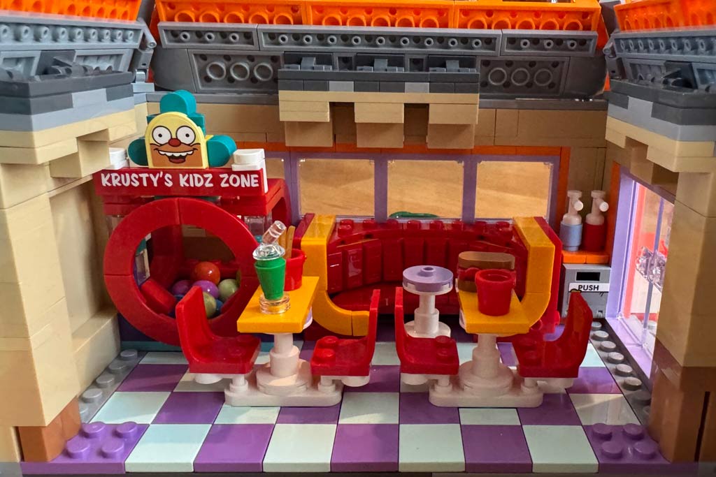 Das Set besteht aus 1.635 Teilen und ist somit hinsichtlich der Teileanzahl merklich kleiner als die beiden Vorgänger-Modelle, bei gleichbleibender UVP (und stark gestiegenen Preisen in der „Zwischenzeit“). Neben dem eigentlichen Restaurant sind sieben Minifiguren enthalten: Krusty der Clown, Homer, Bart, Lisa, Sideshow Bob, Officer Lou und der Squeaky Voiced Teen. Mit diesen Charakteren kann man direkt typische Szenen aus der Serie nachspielen. Marge und Maggie jedoch fehlen – sind doch aber auch hungrig!