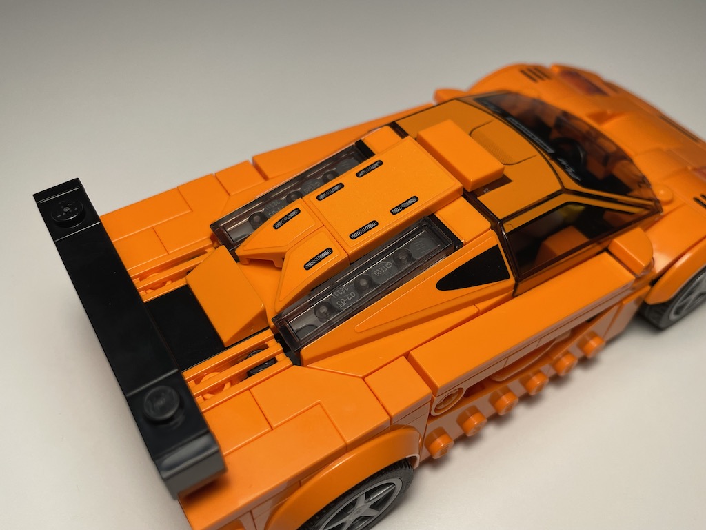 Der McLaren Solus GT gehört zur McLaren Ultimate Series und basiert auf einem Konzept aus dem Videospiel Gran Turismo Sport. Das Auto ist auf 25 Einheiten limitiert und glänzt mit seinem futuristischen Look. Wie auch das Original ist die LEGO Umsetzung sehr kantig gehalten. Die dreieckigen Fliesen erzeugen einen schönen Look. Die verschiedenen Wedge Plates und Tiles gehen durch Gelenke gut ineinander über. Nicht jedem sagt das futuristische Design der Vorlage zu, aber ich finde, es ist eine gelungene Abwechslung in der Themenwelt.