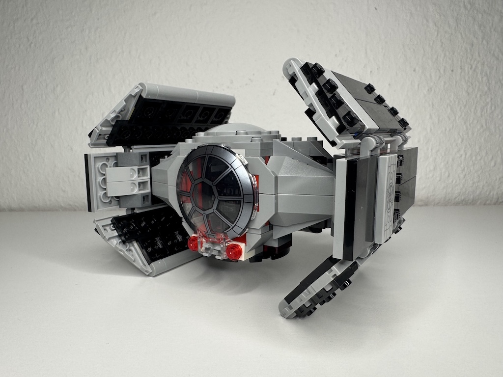 Der TIE Advanced sieht von vorne erstmal ziemlich solide aus. So ist der erste Eindruck des Gebildes schonmal besser als der des SMART Play X-Wings. Die Proportionen stimmen, die Flügel sind schick abgerundet und die Cockpitscheibe passend bedruckt.