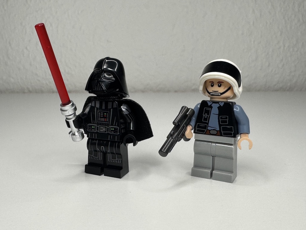 Im Set sind zwei Minifiguren enthalten. Darth Vader ist hier als Smart Minifigur beigelegt. Er interagiert also mit dem Smart Brick. Da sich im Inneren der Figur technische Elemente befinden, sind Torso und Beine fest miteinander verbunden. Vader ist dank mehrerer Drucke klar als Smart gekennzeichnet. So versteckt sich hinter dem (zu kurzen) Cape ein großer Smart Brick Druck und unter den Armen finden sich Warnhinweise, die zwar rechtlich notwendig sind, aber die Figur doch sehr verunstalten. Ein Rebellensoldat ist als normale Figur mit von der Partie. Nichts besonderes, aber kann man eigentlich immer gebrauchen. Schade, dass bei diesem hohen Preis nicht noch eine dritte Figur wie zum Beispiel Großmoff Tarkin beigelegt wurde.