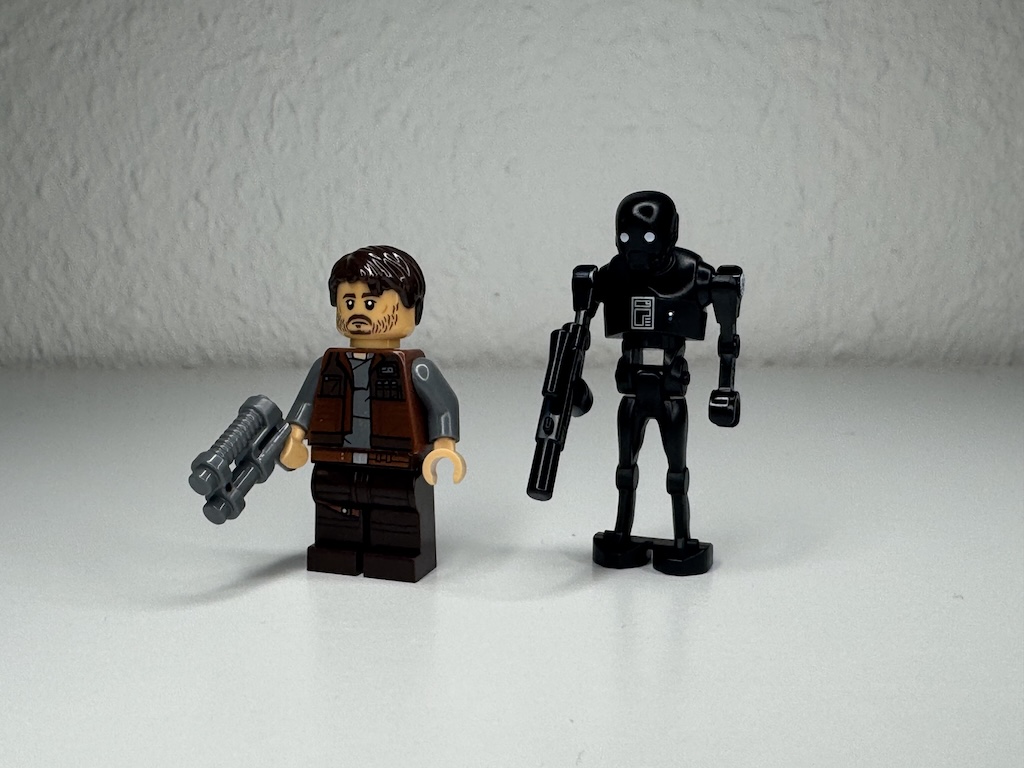 Das Set umfasst neben dem Raumschiff vier Minifiguren. An der Rebellenfront stehen Cassian Andor und dessen treuer Droidenbegleiter K-2SO. Die Figuren sind den finalen drei Episoden der zweiten Staffel nachempfunden und fangen das Aussehen der Charaktere sehr gut ein. Der Droide hat zudem einen neuen Körper spendiert bekommen, der nochmal robuster als die Version aus 2016 wirkt.
