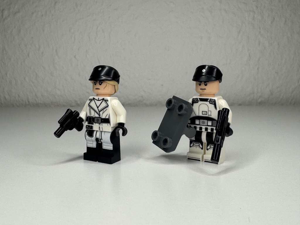 Auf Seiten des Imperiums finden wir Dedra Meero und einen ISB Tactical Agent vor, die ebenfalls auf den besagten Episoden basieren. Dedra trägt ein neues Mützenelement, aus dem ihre streng zusammengebundenen Haare hervorschauen und ein weißer Mantel bedeckt ihre ISB-Uniform. Leider stimmt der Druck auf den Beinen nicht mit der Farbe des Manteltorsos überein. Hier wären Dual Molded Legs sicherlich die bessere Option gewesen. Der Agent ist passend umgesetzt und recht detailliert. Als Zubehör hält dieser neben einem Standardblaster auch einen Schild bereit.