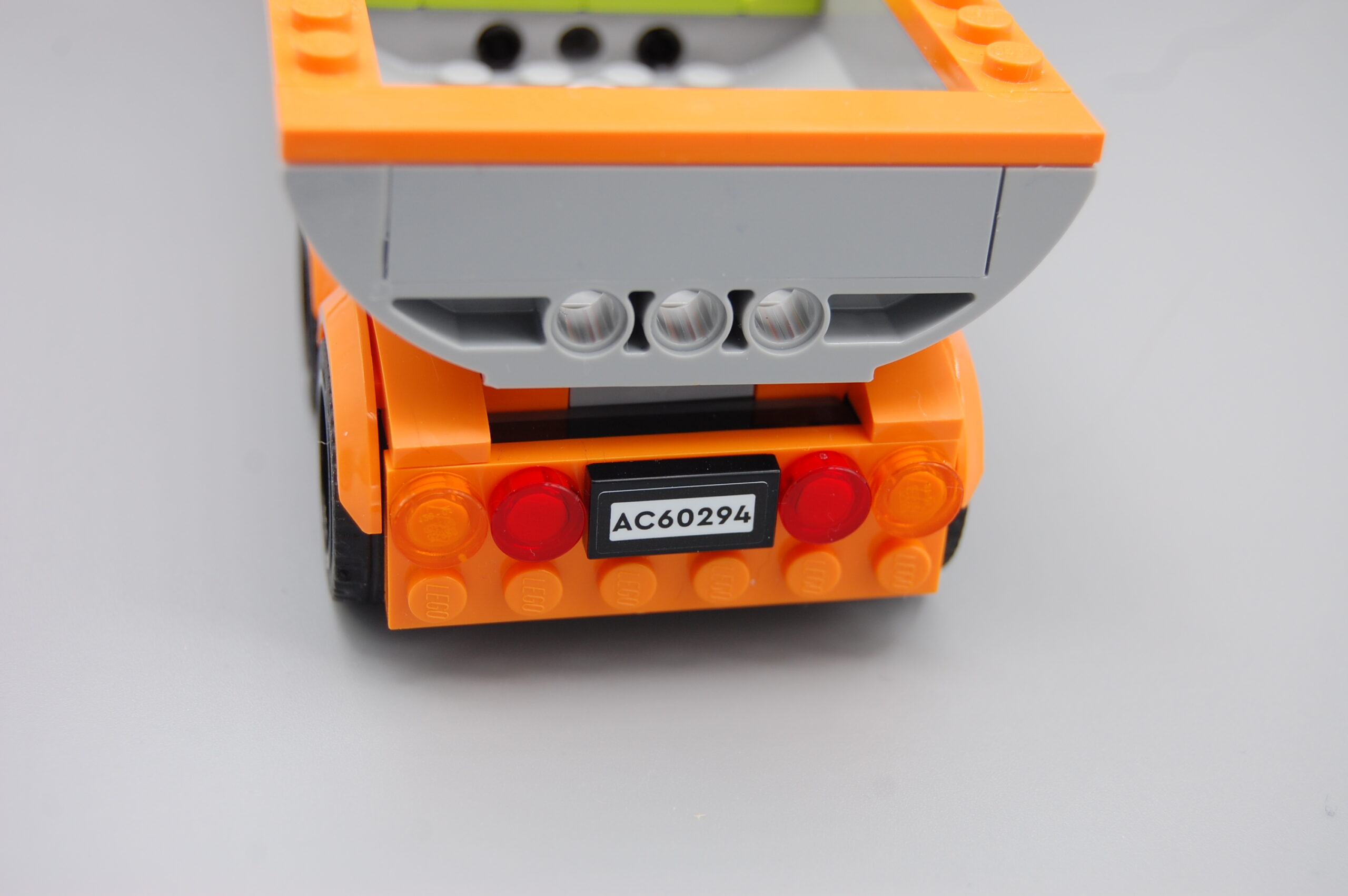 Das Modell ist relativ groß, wenn es zusammengebaut vor einem steht. Beinahe 50 cm Länge und 7cm (8 Noppen) in der Breite messen Zugmaschine und Auflieger. Die Optik ist natürlich recht grell, bedingt durch das Zusammenspiel von Orange und Lime.