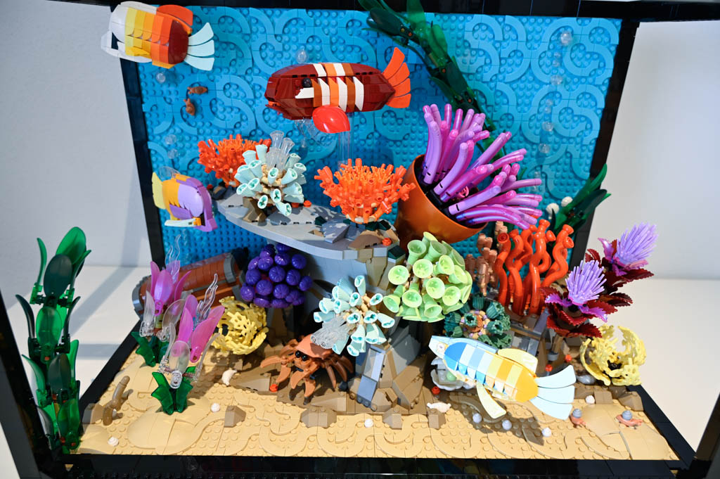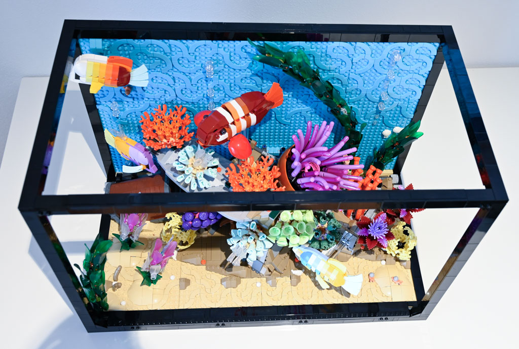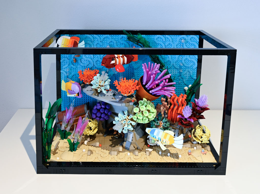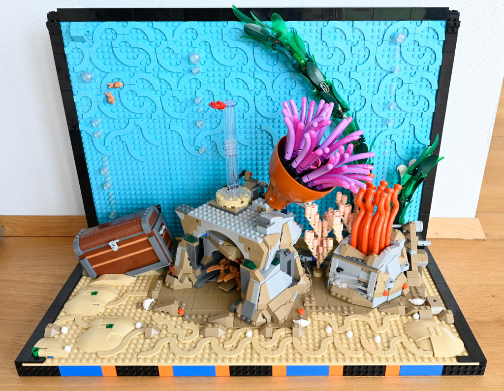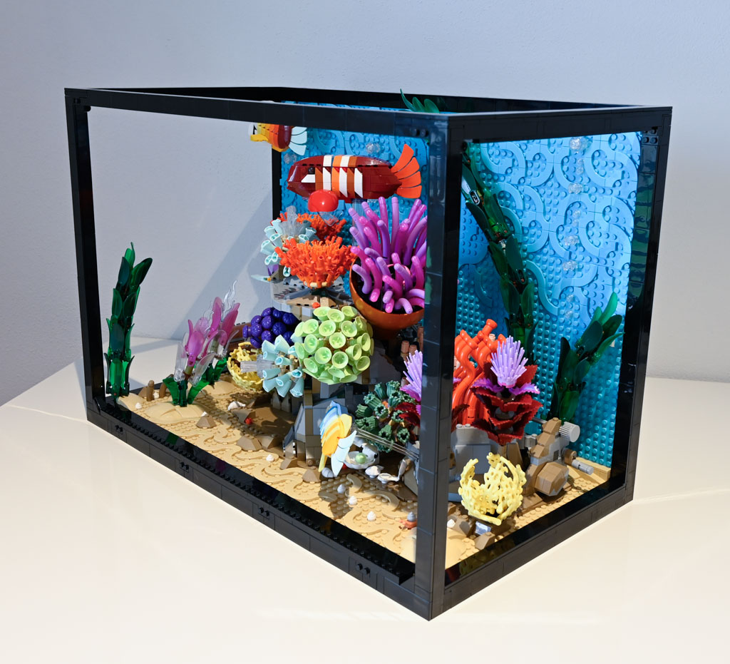 Mir persönlich hätte ein Meeres-Diorama, ohne den großen Rahmen und auch ohne die Rückwand wahrscheinlich besser gefallen. Das Schöne an LEGO ist schließlich etwas, was ich sonst nicht ins Wohnzimmer bekommen würde, mit Klemmbausteinen gewissermaßen einzufangen. Ein Deko-Objekt mit LEGO quasi im Maßstab 1:1 nachzubauen ist für mich da eher weniger reizvoll. Das LEGO Aquarium hat für mich auch nicht den gleichen Effekt eines echten Aquariums, da es einfach statisch ist und natürlich nichts Lebendiges drin ist.