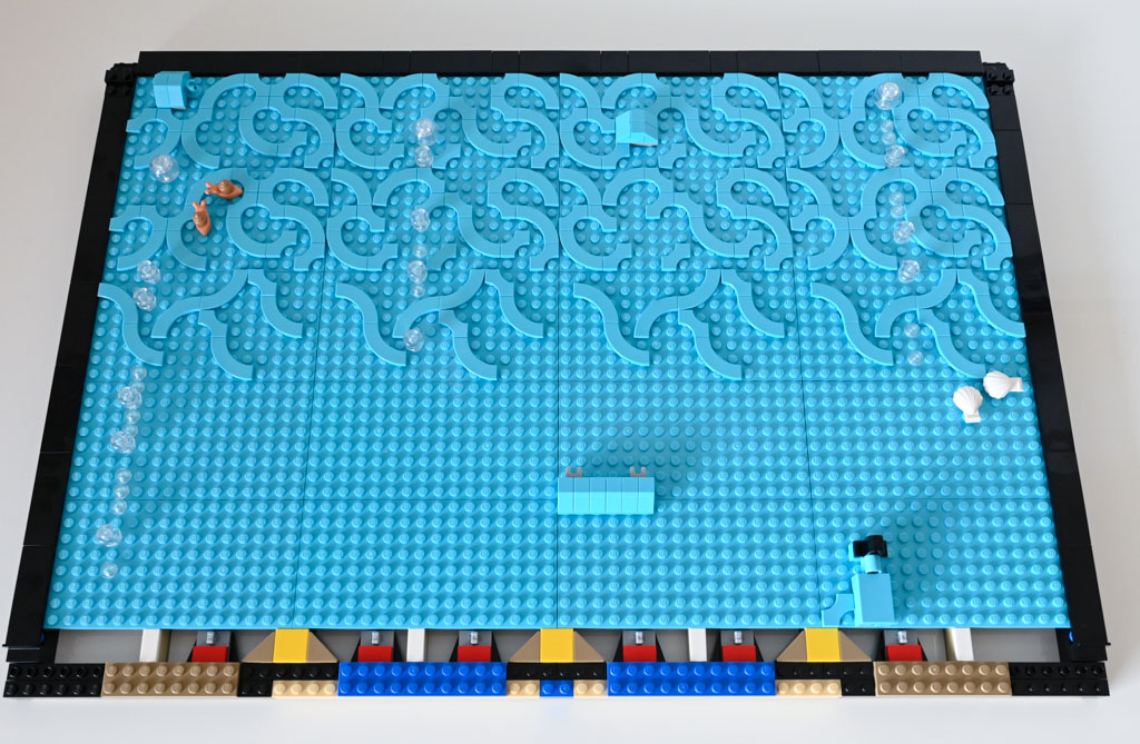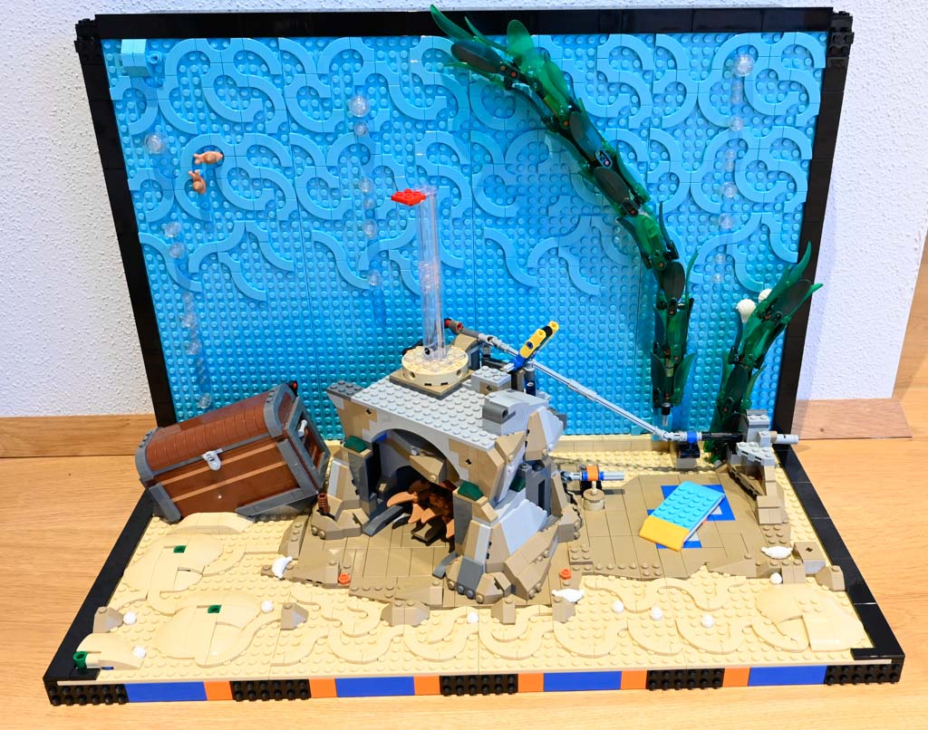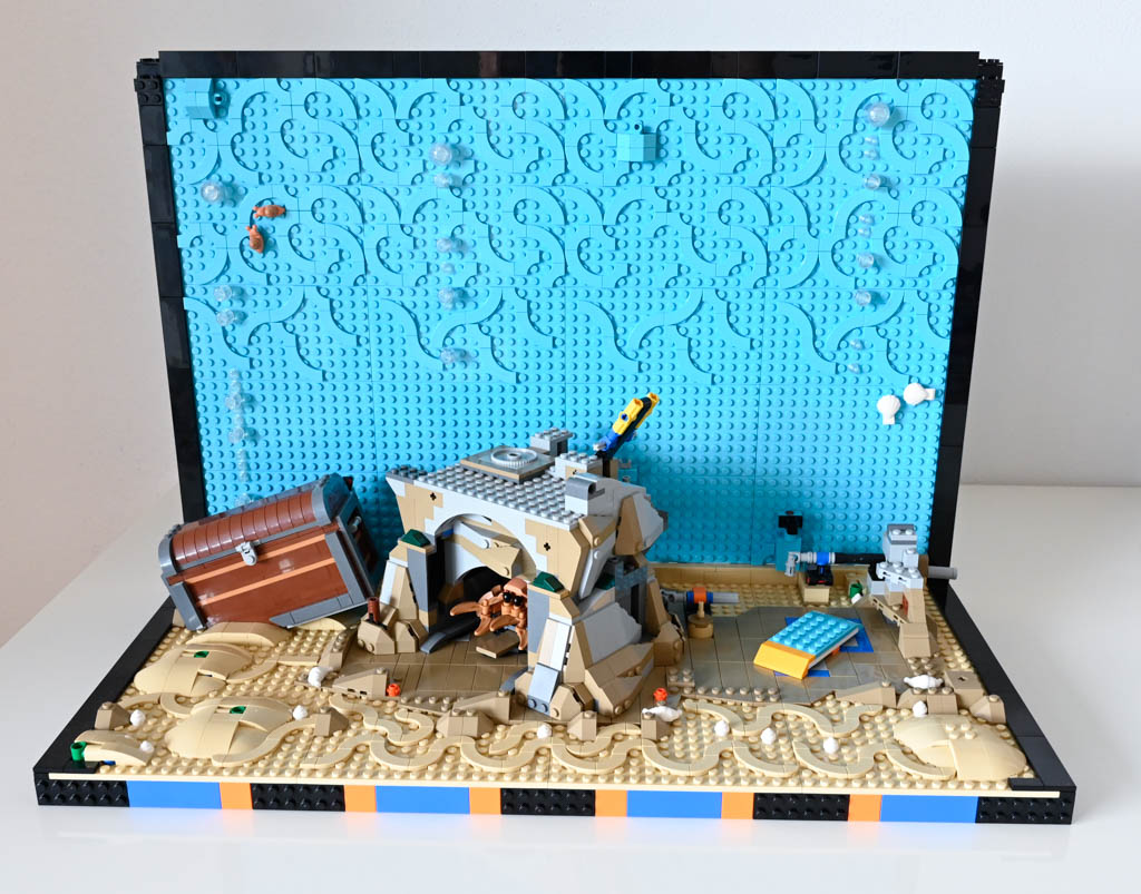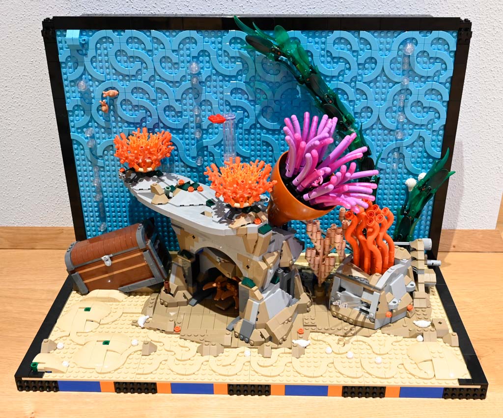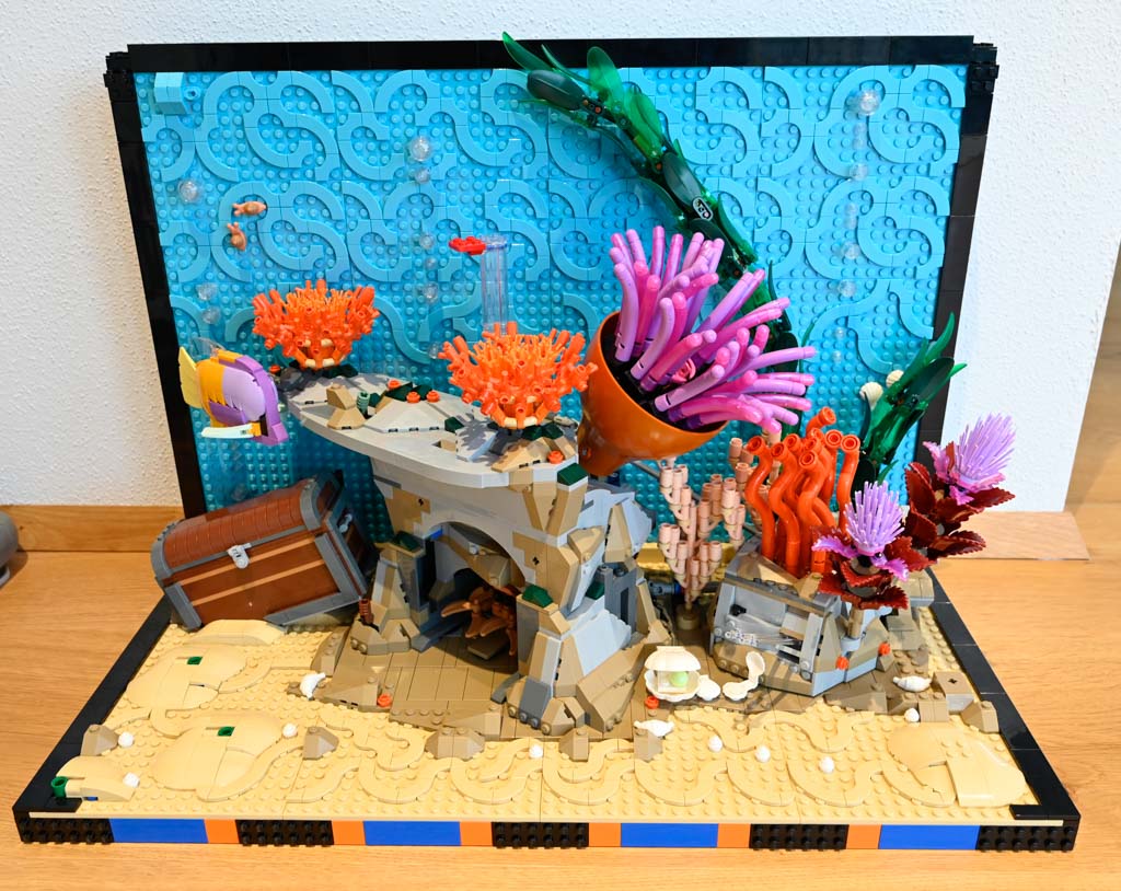 Mir persönlich hätte ein Meeres-Diorama, ohne den großen Rahmen und auch ohne die Rückwand wahrscheinlich besser gefallen. Das Schöne an LEGO ist schließlich etwas, was ich sonst nicht ins Wohnzimmer bekommen würde, mit Klemmbausteinen gewissermaßen einzufangen. Ein Deko-Objekt mit LEGO quasi im Maßstab 1:1 nachzubauen ist für mich da eher weniger reizvoll. Das LEGO Aquarium hat für mich auch nicht den gleichen Effekt eines echten Aquariums, da es einfach statisch ist und natürlich nichts Lebendiges drin ist.