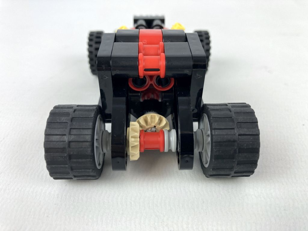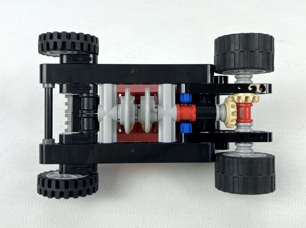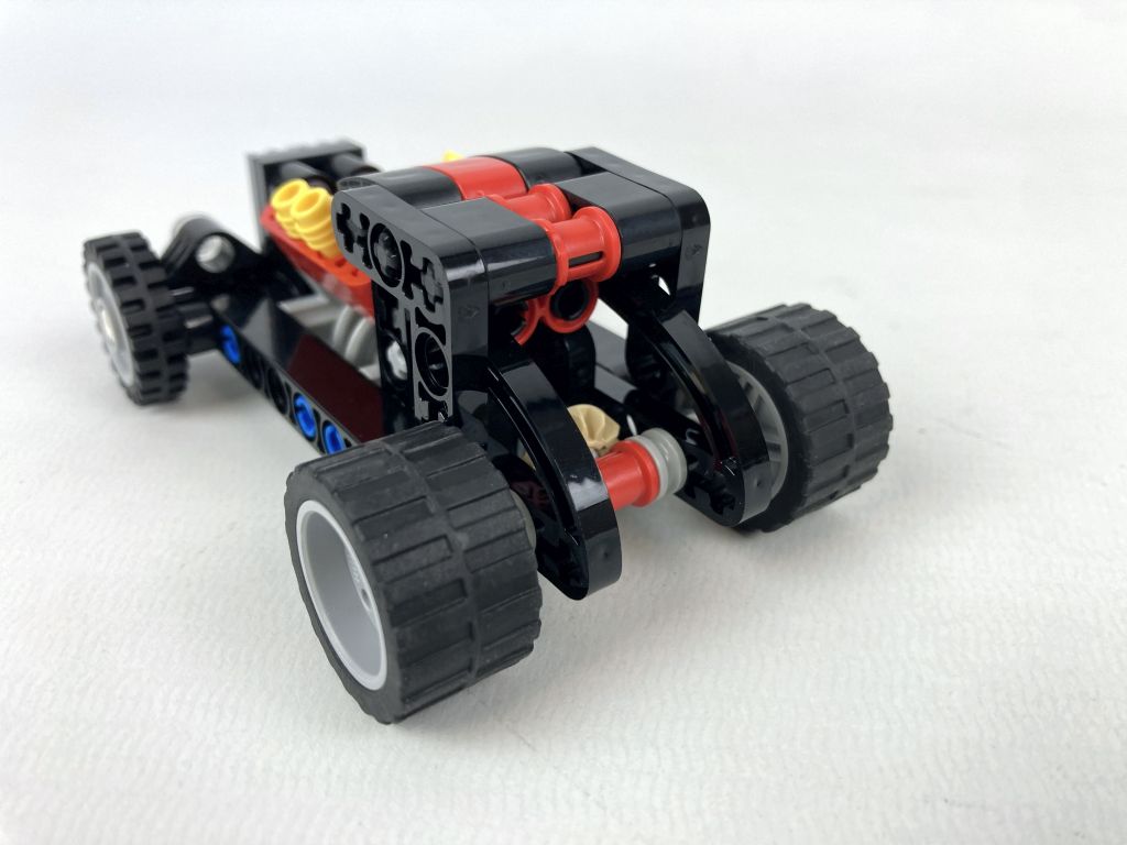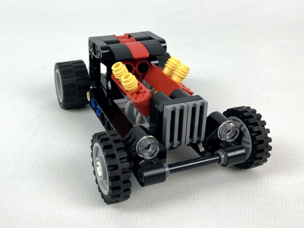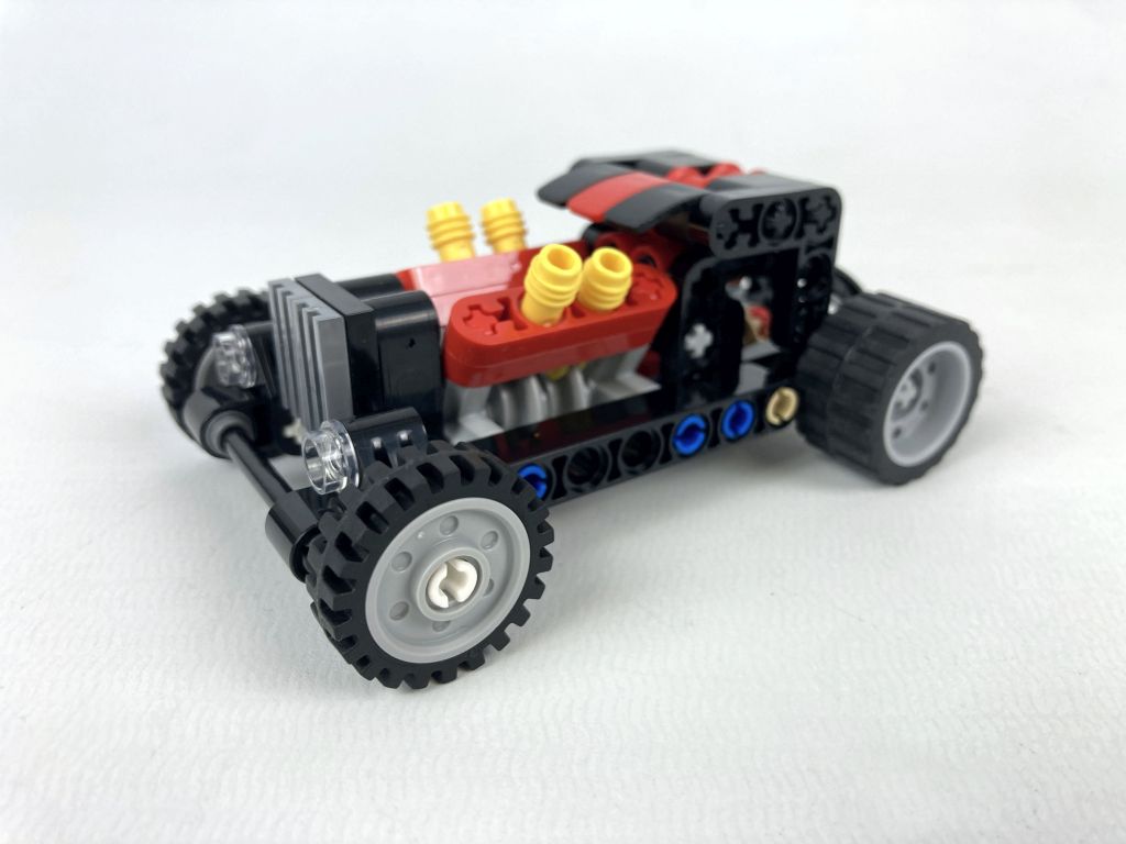 Der kleine Hot Rod ist etwa 10 cm lang, 6 cm breit und 4 cm hoch. Die starre Hinterachse ist über ein kleines Getriebe mit dem Motor verbunden. Für einen stilechteren V8 reichte der Platz nicht, so wurde nur ein V4 verbaut. Weitere Funktionen gibt es keine. Man kann das Wägelchen vor und zurück schieben und sich neben der Optik an der Bewegung der Kolben erfreuen. Kurven sind auch nicht drin, außer man radiert mit den Rädern über den Tisch.