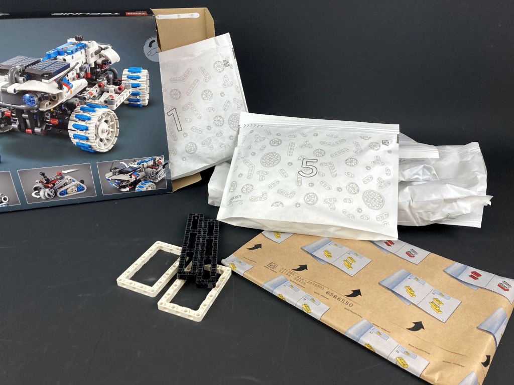 Vier Technic-Rahmen haben es im Inneren nicht mehr in eine der Papiertütchen geschafft. In einem extra Umschlag sicher verpackt sind hingegen die Anleitungen und der kleine Sickerbogen. Von überschaubaren sechs Aufklebern landen später jeweils zwei auf dem großen Rover, dem Schürfrover und dem Probenbehälter. Nur der kleine MAPP-Rover kommt ohne aus.