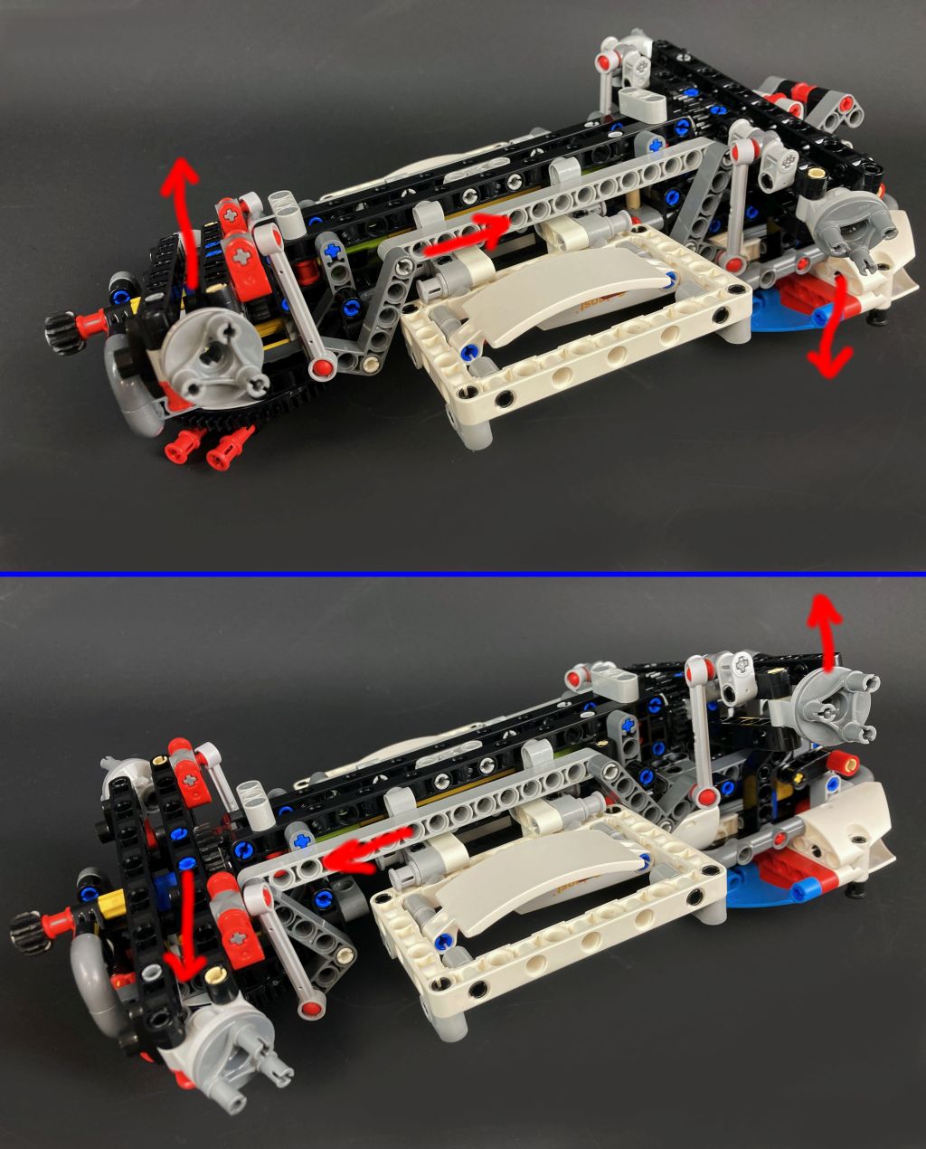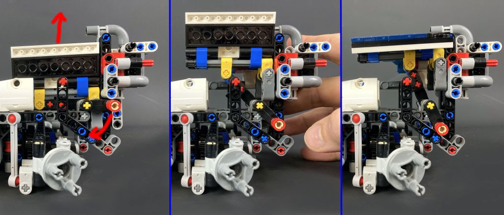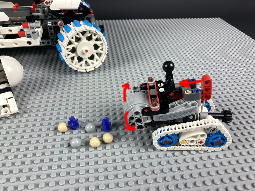 Seitlich zwischen den Achsen befinden sich zwei kleine Plattformen. Hier können der Schürfrover und der Probenbehälter abgestellt und so auf dem großen Rover transportiert werden. Damit sie an Bord gelangen, ist der Rover mit einem Kran ausgestattet. Über ein Zahnrad am Heck kann der untere Kranarm nach oben gekurbelt werden. Auf diesem sitzt ein weiteres Bedienrad, über das der vordere Teil ausgeklappt wird. Der ganze Kran ist auf einem Technic Zahnkranz montiert und lässt sich anschlagsfrei um die eigene Achse drehen.