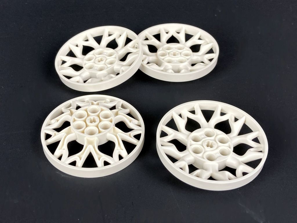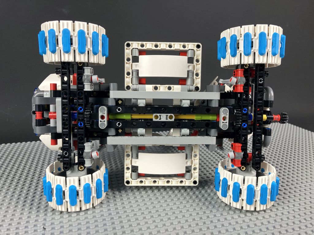 Die Räder sind aus den großen Technic Kettengliedern aufgebaut. Dicke, blaue Gumminoppen verleihen dem Rover auch auf glatten Untergründen den notwendigen Grip.