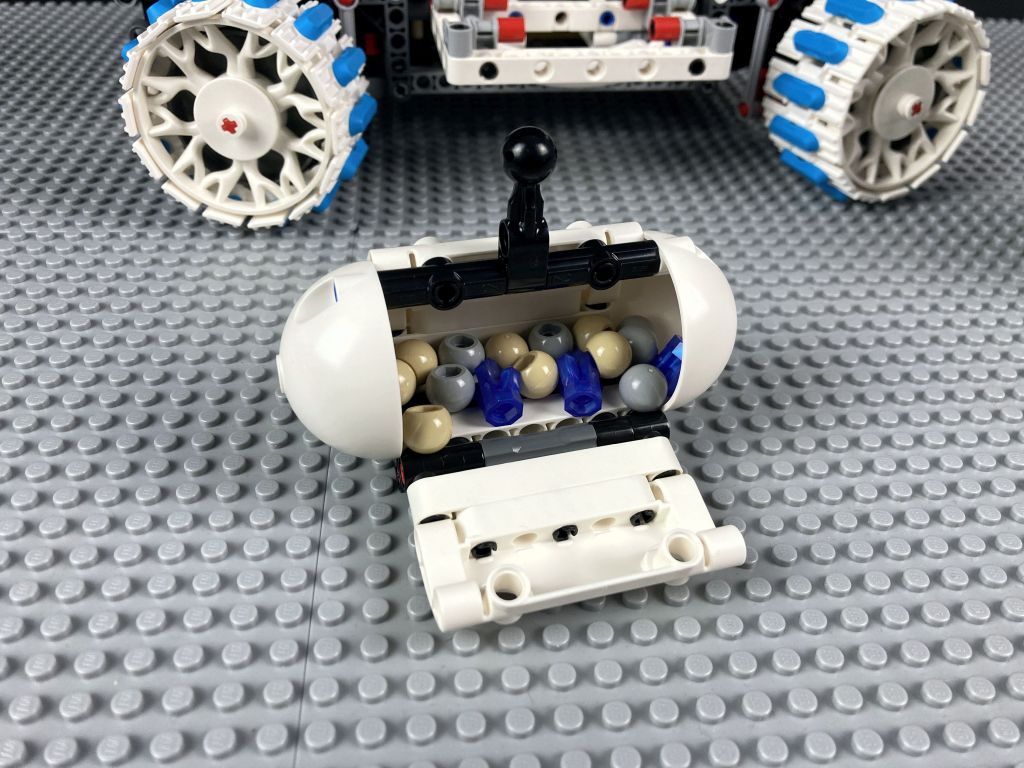 Die aufgesammelten Gesteinsproben kommen dann in den Probenbehälter. Auch dieser hat das Kügelchen oben drauf, um vom Kran aufgenommen zu werden. Mit einer Länge von knapp 10 cm, einer Breite von 4 cm und 7 cm Höhe ist er nicht viel kleiner als der Schürfrover. Zum Befüllen und Entladen wird eine Seite heruntergeklappt.