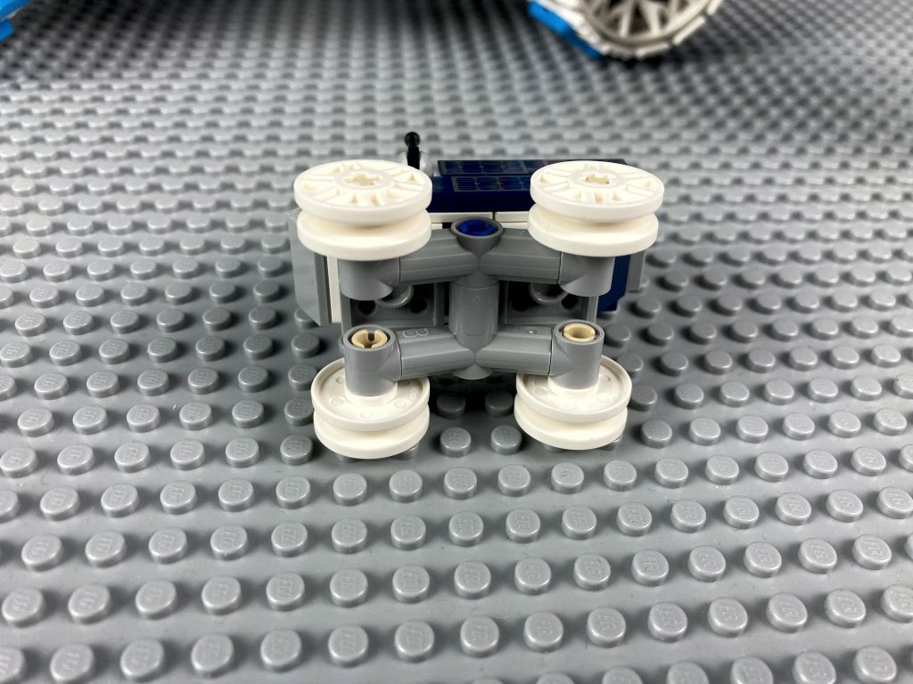 Das Nesthäckchen im Bunde ist der MAPP-Rover. Er ist 6 cm lang, 4 cm breit und mit Antennen 5 cm hoch. Außer Fahren kann er nicht viel, vor allem im Vergleich zu seinen Kollegen im Set. Die Räder auf jeweils einer Seite sind an einem Technic Winkelelement montiert und über einen Technic Pin schwingend aufgehängt. So können auch kleine Hindernisse ausgeglichen werden, zumindest theoretisch. Praktisch funktioniert das auf Grund seiner geringen Größe und der doch sehr rutschigen Räder nur eingeschränkt.