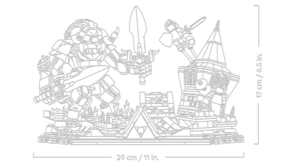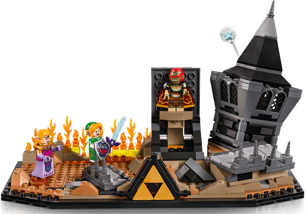 Baumeister können außerdem ikonische Gegenstände aus dem Spiel präsentieren, darunter das Master-Schwert, den Hylia-Schild, den Megaton-Hammer und Zeldas Kraft, dargestellt durch Lichtwellen. Interaktive Elemente bereichern das Bauerlebnis: Entdecke verborgene Schätze, lass Ganondorf wiederauferstehen und interagiere mit einer aus LEGO Steinen gebauten Ganon-Figur. Das Set enthält außerdem ein transparentes Modell der Fee Navi sowie Stoffumhänge und Waffen für die Figuren, was die Spiel- und Ausstellungsmöglichkeiten erweitert.