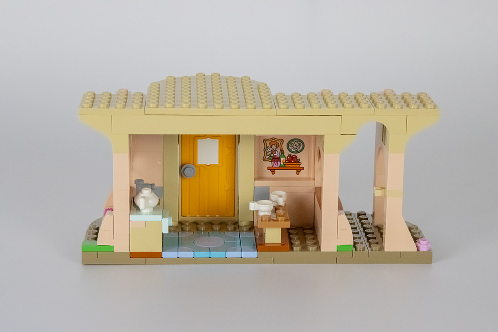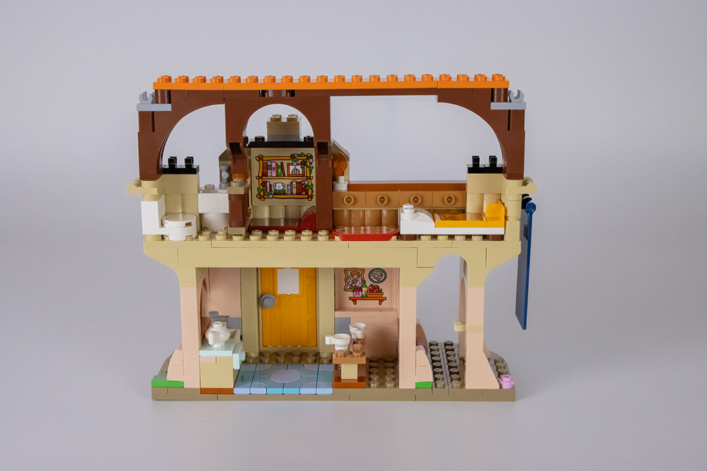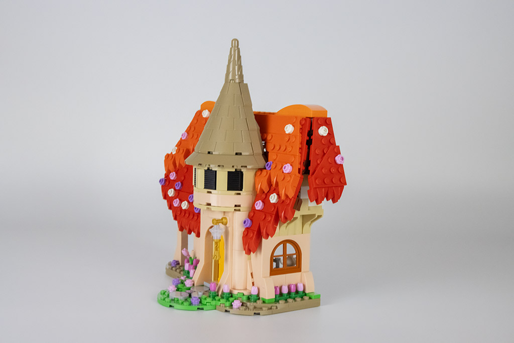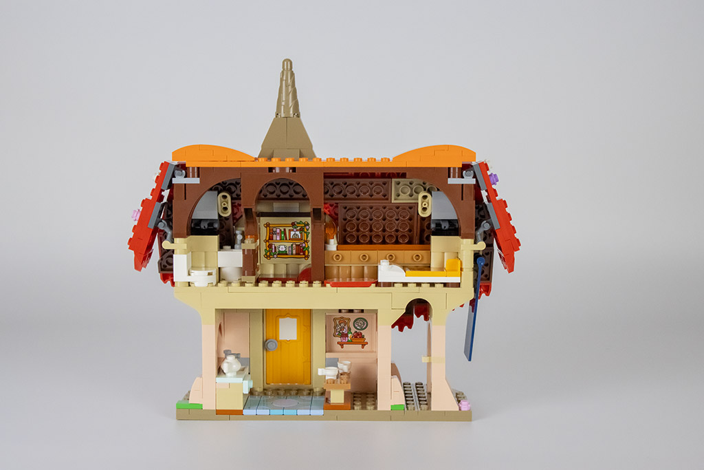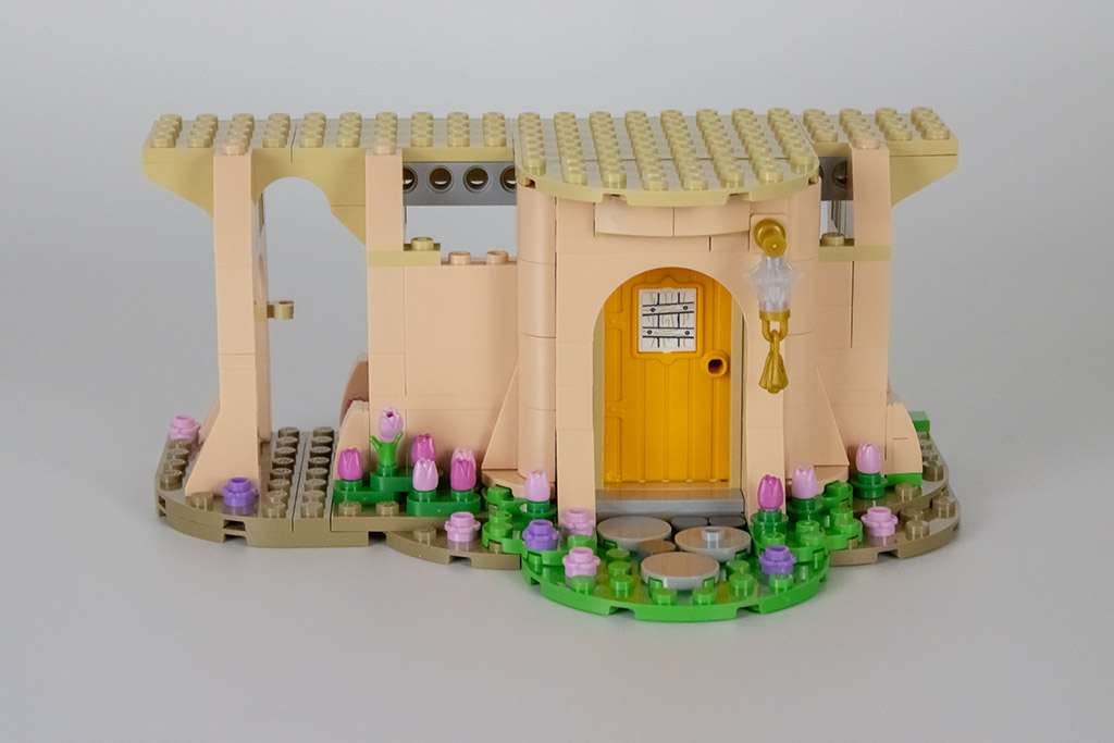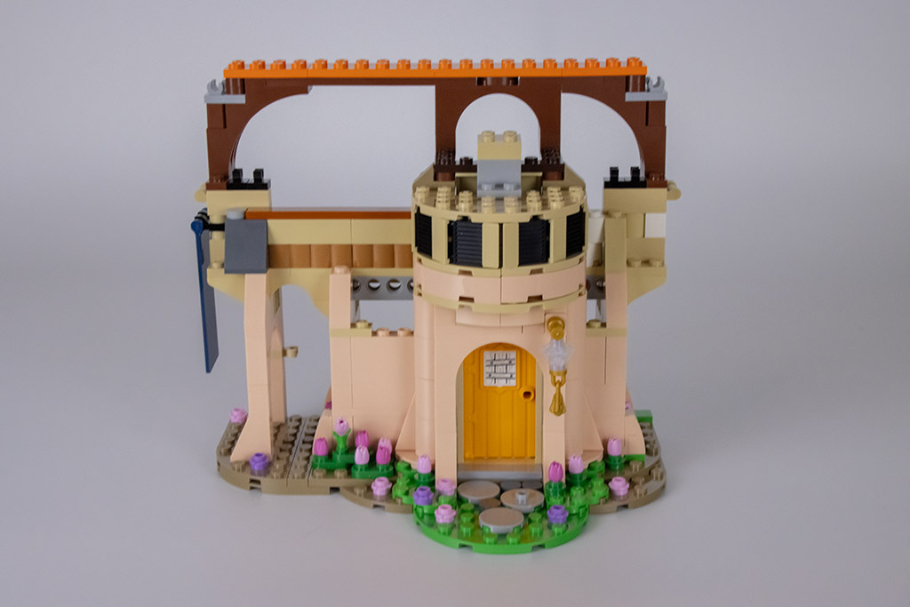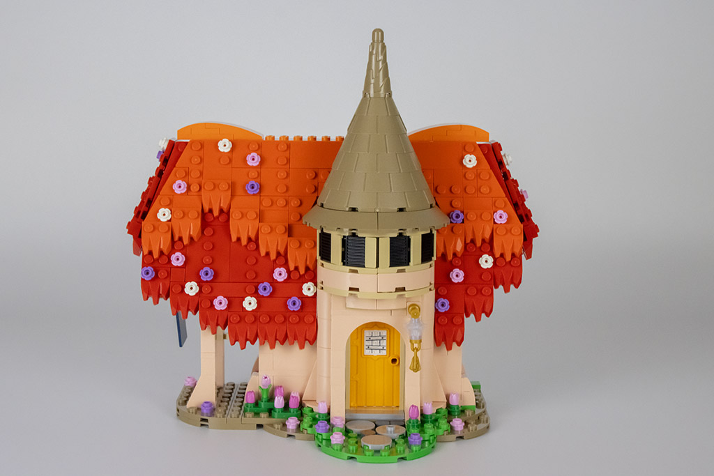 Die helle Nougatfarbe harmoniert in meinen Augen ganz gut mit der rot-orangenen Farbe des Daches. Nimmt sich zurück, lässt aber zugleich das Dach intensiver aufleuchten, verstärkt seine Wirkung sozusagen. Die Farbgebung wird insgesamt vom Filmsetting bestimmt. Dort ist dieses Haus ähnlich bemalt, das helle Nougat von LEGO kommt dem „sehr hell sandigen“ Farbton am nächsten. Tan wäre zwar ebenfalls möglich, würde meiner Empfindung nach aber nicht dieselbe märchenhafte Wirkung erzielen und das Gebäude langweiliger, fast stumpf wirken lassen. Im Film ist die Wirkung der Farben insgesamt weniger auffällig, da das Rot vom Dach dort eher blass und dunkel wirkt, aber durch LEGOs eigener Farbpalette, in welcher Rot und Orange (und auch das neue Rot-Orange) viel leuchtender sind. Insgesamt passt die Umsetzung jedoch.