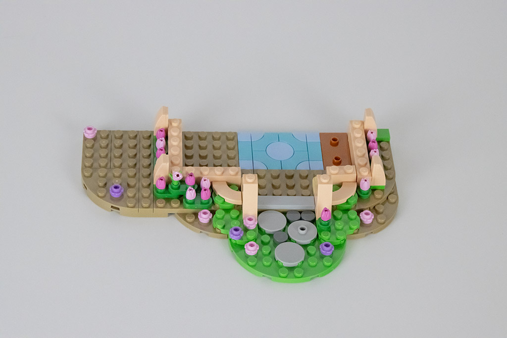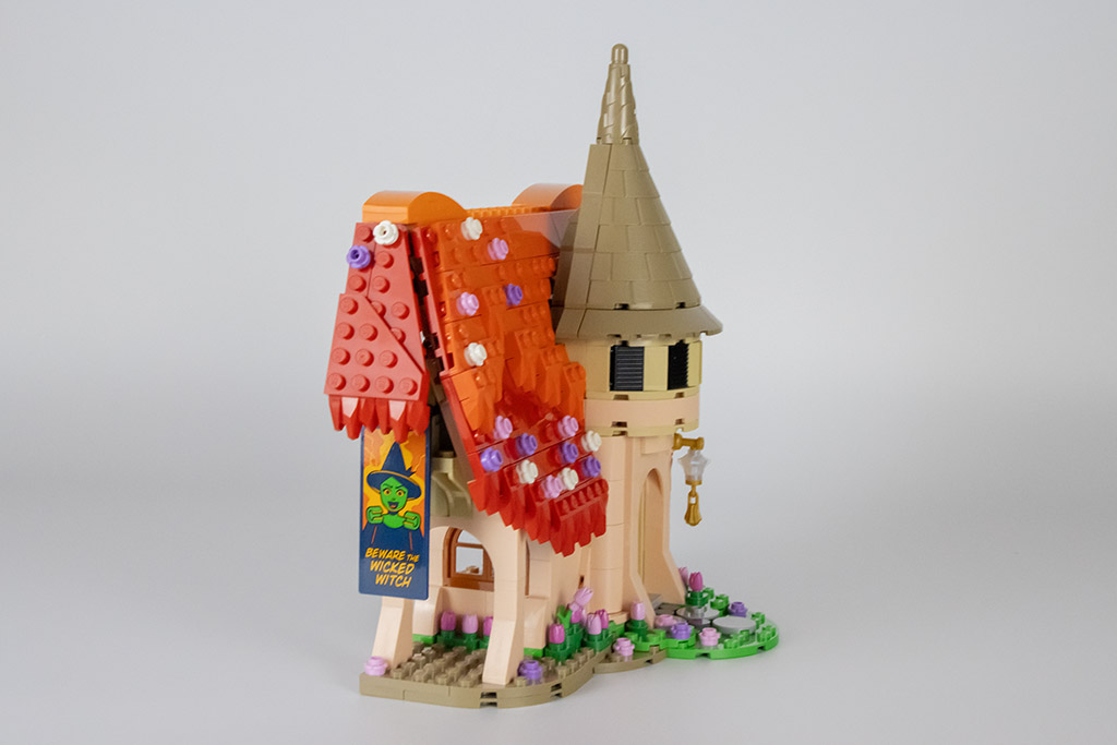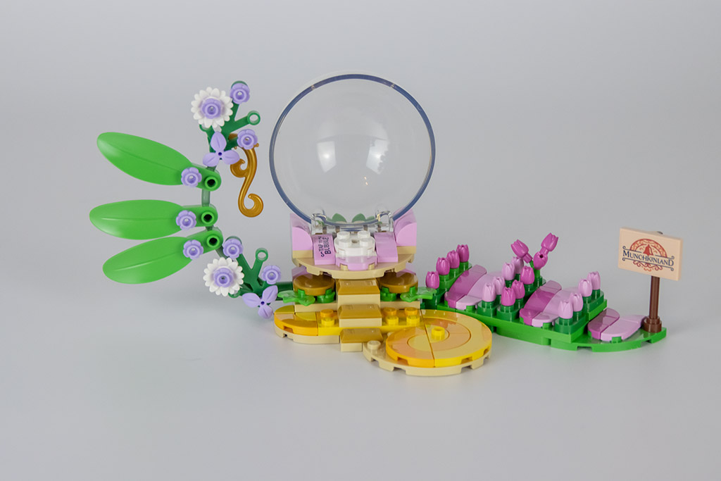 Auf den Nebenbuild hätte LEGO verzichten können, verstehe aber warum er dabei ist. Es ist die Szene von Glindas Ankunft im Munchkinlanddörfchen, die die (frohe) Nachricht verkündet (und später auch ihre im Begriff startende Abreise, bevor ihr noch eine Frage von einer der Munchkinländer gestellt wird). Schade, dass sich LEGO hier die andere Hälfte der Kugel gespart hat. Die ganzen Blumen (auch am Haus), es sind Tulpen, sind dem Film entnommen, sie sollen die riesigen, etliche Meter langen Tulpenfelder um den Ort abbilden (welche das Studio übrigens tatsächlich angebaut/angepflanzt hat). Für deren Farbe im Set hat sich LEGO aber sehr an Glindas Vorliebe zu Rosa orientiert.